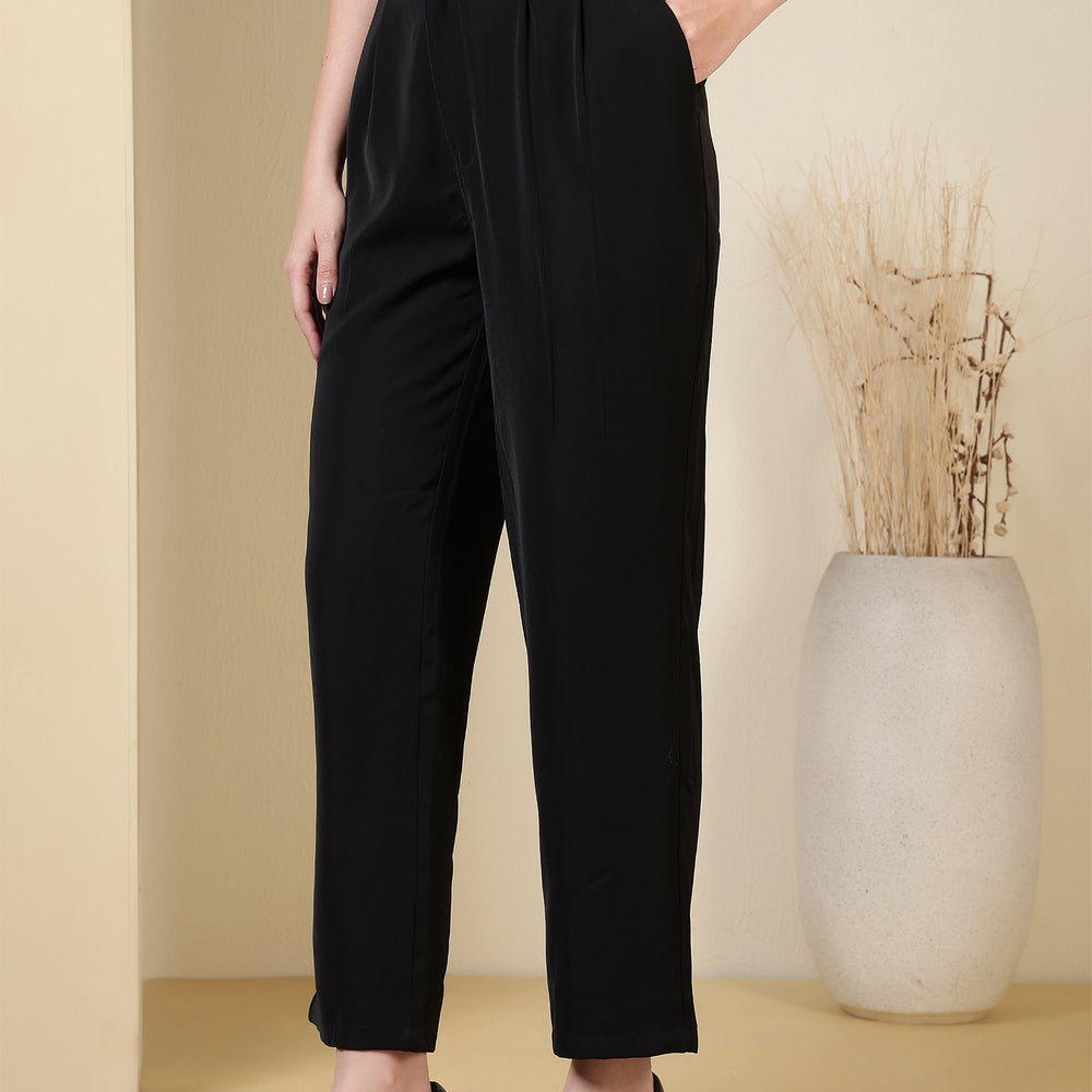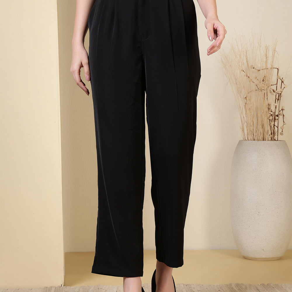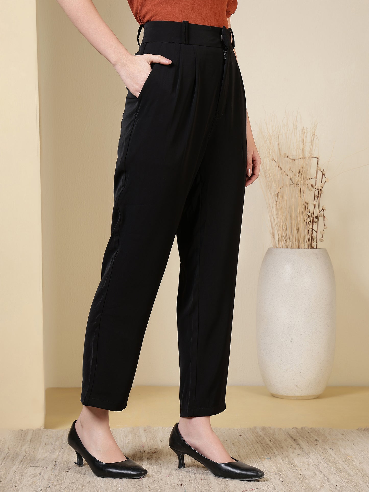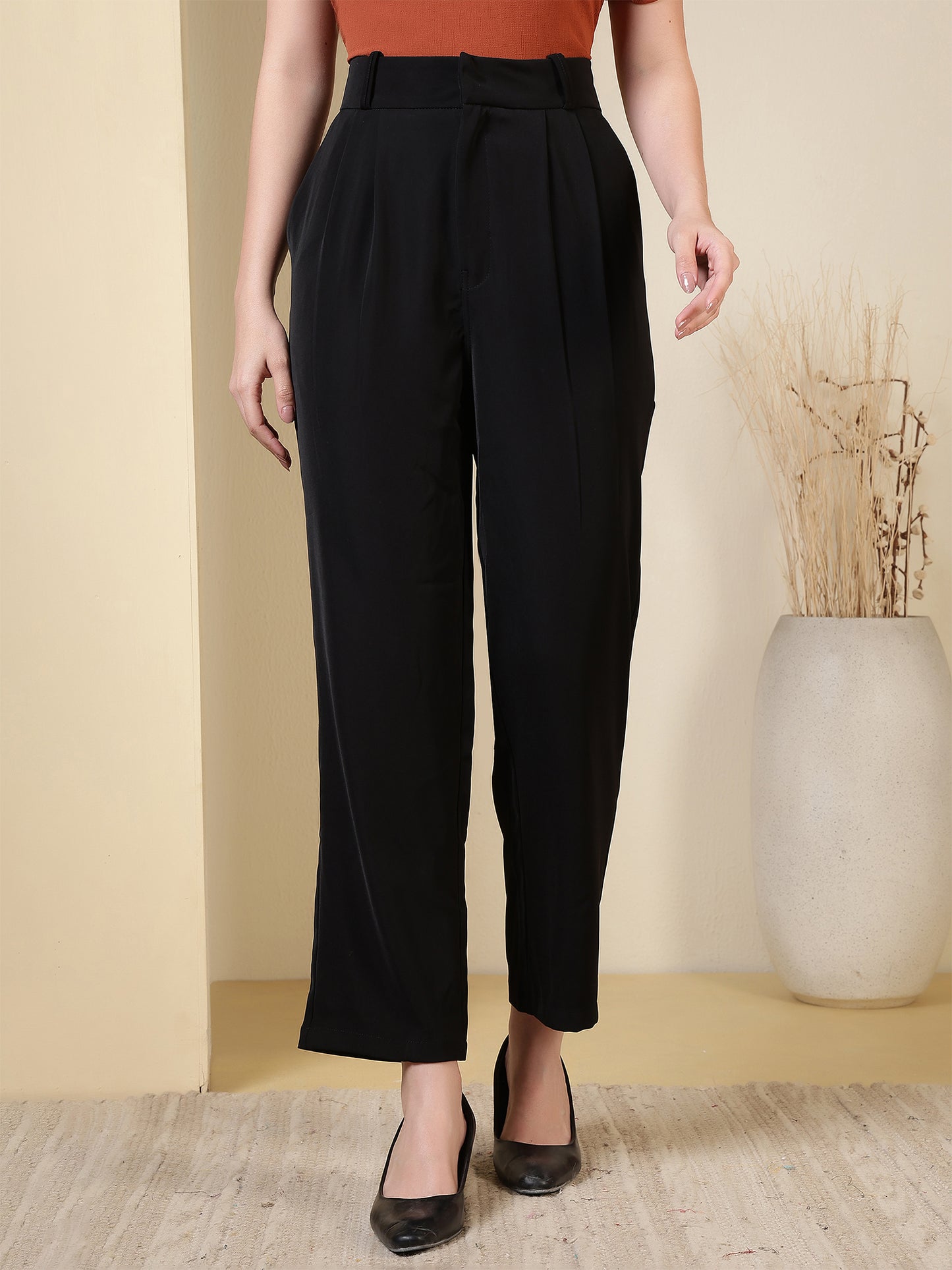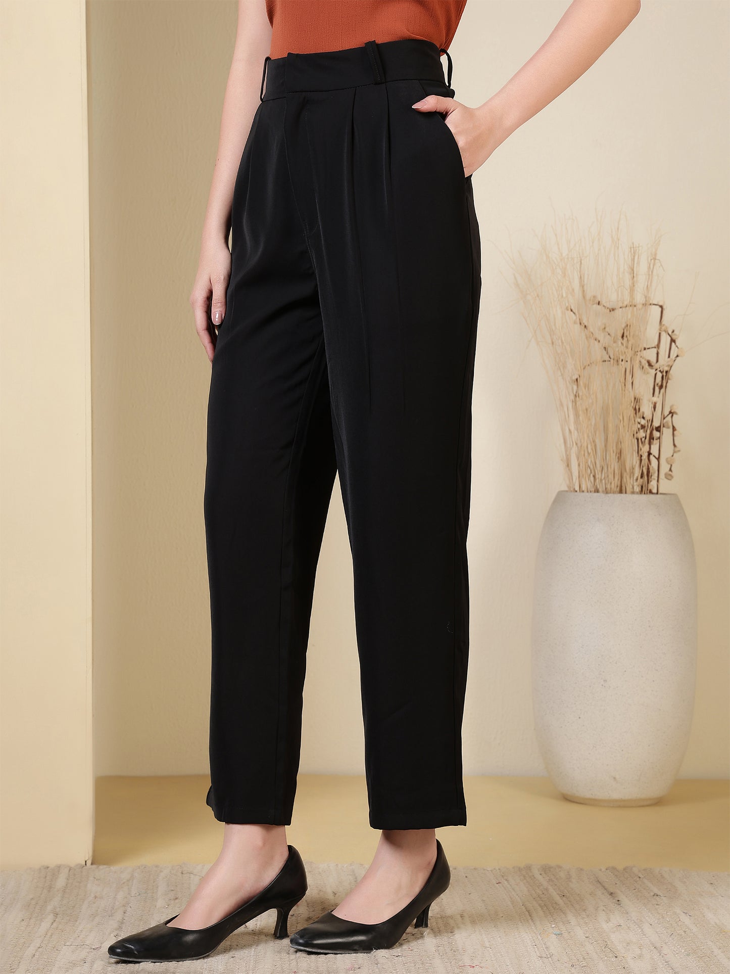 Women’s High-Rise Straight Fit Solid Trousers with Pleated Front | Office Wear & Casual Wear Comfort Pants