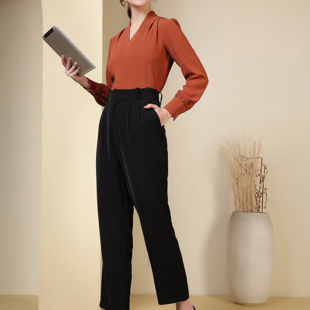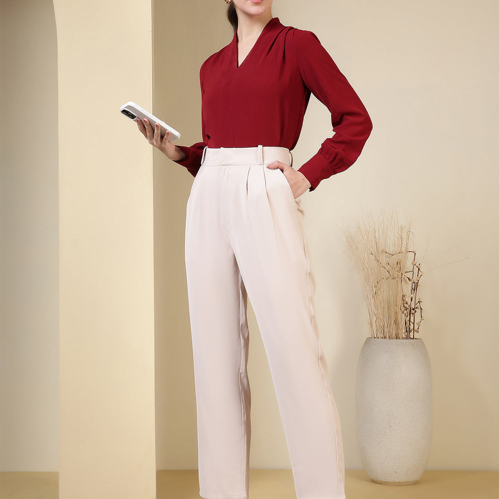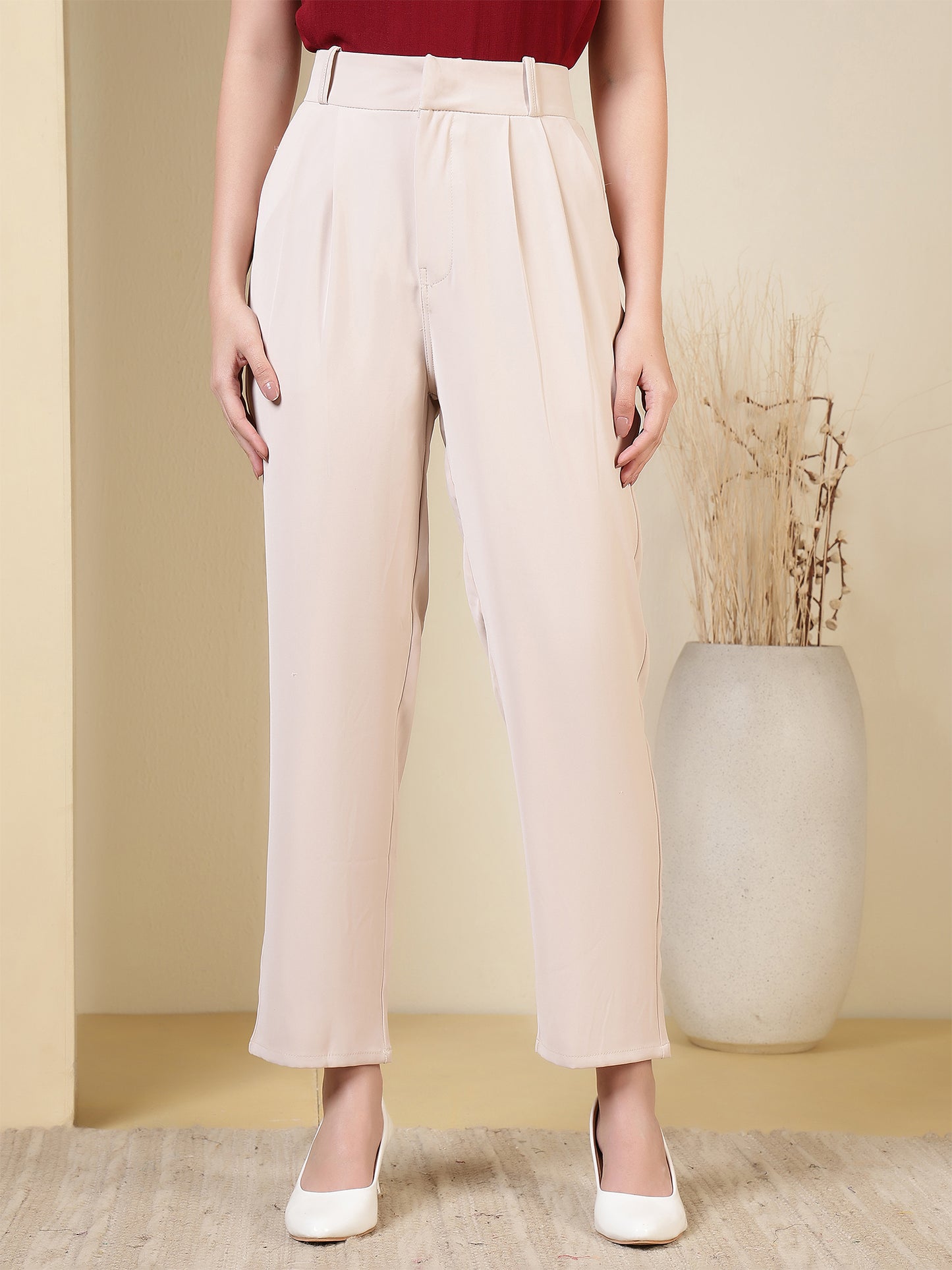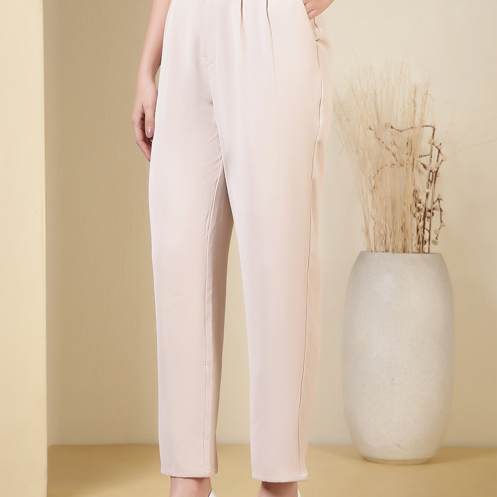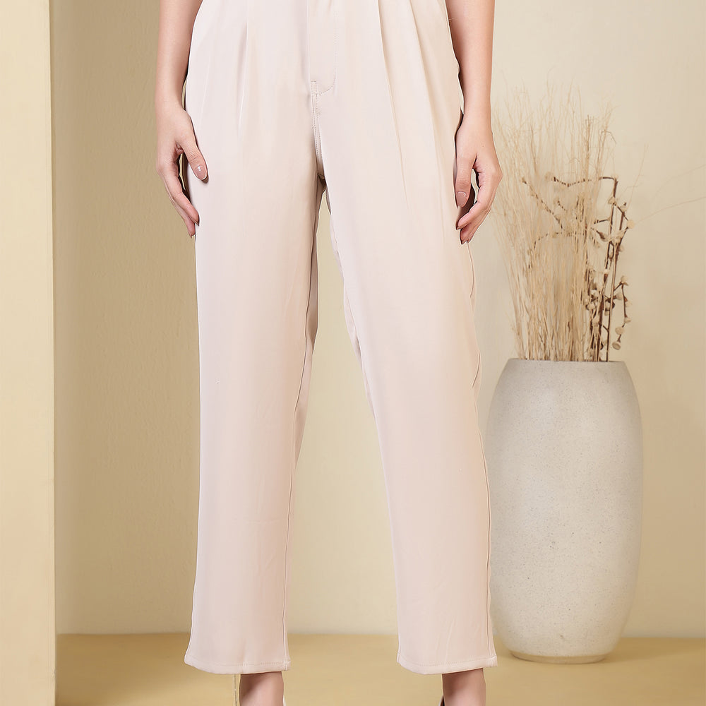 Upgrade your wardrobe with these elegant high-rise straight-fit trousers designed for all-day comfort and effortless style. Crafted from soft, lightweight fabric, these trousers feature a clean solid color, refined front pleats, and a structured waistband with belt loops for a polished, tailored look. The ankle-length design offers a modern silhouette that pairs beautifully with both formal and casual tops, making it ideal for office wear, meetings, brunch outings, or everyday styling. With a smooth drape and versatile neutral tone, these trousers bring together sophistication and comfort in one must-have wardrobe essential.