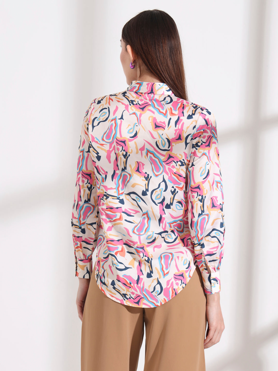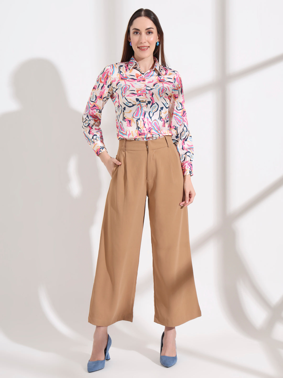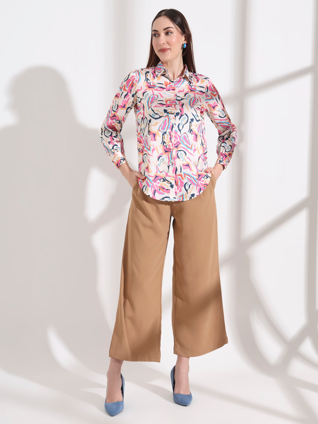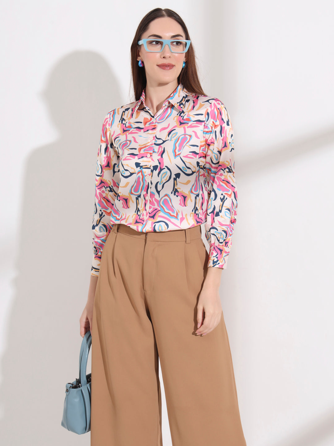 Women’s Abstract Print Slim Fit Formal Shirt in Cream is a stylish and versatile addition that blends modern elegance with professional appeal. Whether you're heading to a business meeting, office, or a casual outing, this women’s shirt is designed to enhance your look effortlessly. Crafted from premium satin fabric, this slim-fit shirt for women offers a smooth, soft texture that drapes beautifully on the body. The abstract print design adds a unique touch, making it a fashionable choice for those who love contemporary styles. The cream color provides a neutral yet classy look that pairs effortlessly with a variety of bottoms, from formal trousers and skirts to casual jeans. Designed with a flattering slim fit, this formal wear shirt for women accentuates your silhouette while ensuring comfort throughout the day. The modern spread collar gives it a sophisticated touch, making it ideal for both corporate settings and semi-formal occasions. The half sleeves allow ease of movement, ensuring you stay comfortable and stylish no matter the occasion. This women's satin shirt is perfect for professionals looking to upgrade their office attire, as well as fashion-forward individuals who appreciate trendy yet timeless pieces. The luxurious satin material not only looks elegant but also feels light and breathable, making it suitable for all seasons. Pair this cream-colored women's shirt with black trousers for a power-dressing look, a pencil skirt for a chic formal outfit, or denim jeans for a relaxed weekend style. Whether you're attending an important meeting, heading out for dinner, or simply dressing up for the day, this shirt is a must-have staple in your wardrobe.
