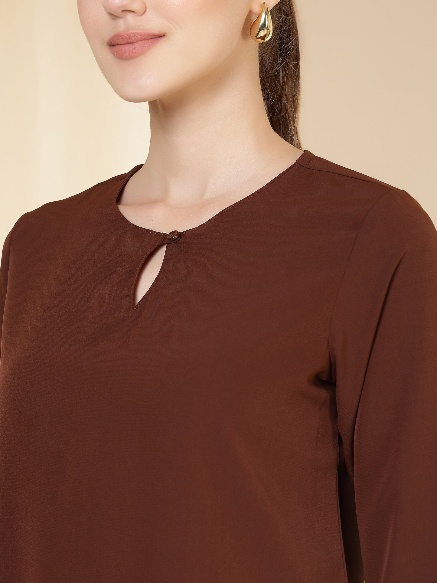Elevate your wardrobe with this stylish women’s top featuring a refined keyhole neckline and comfortable 3/4 sleeves. Designed with a smooth, lightweight fabric, it offers a relaxed yet polished look suitable for office wear, casual outings, or travel. The regular fit ensures all-day comfort, while its minimal and versatile design pairs effortlessly with trousers, jeans, or skirts. Perfect for creating a chic and timeless everyday ensemble.