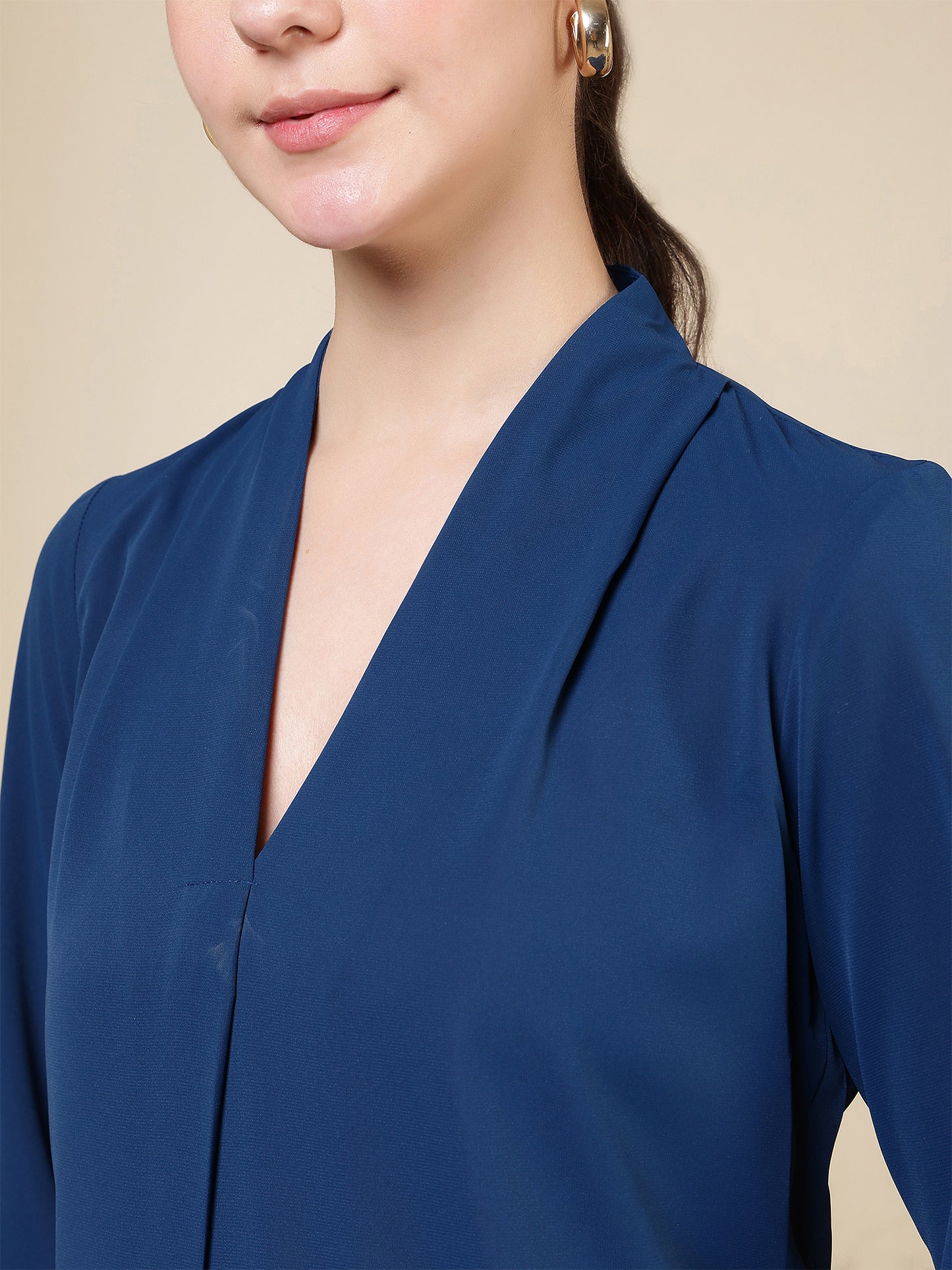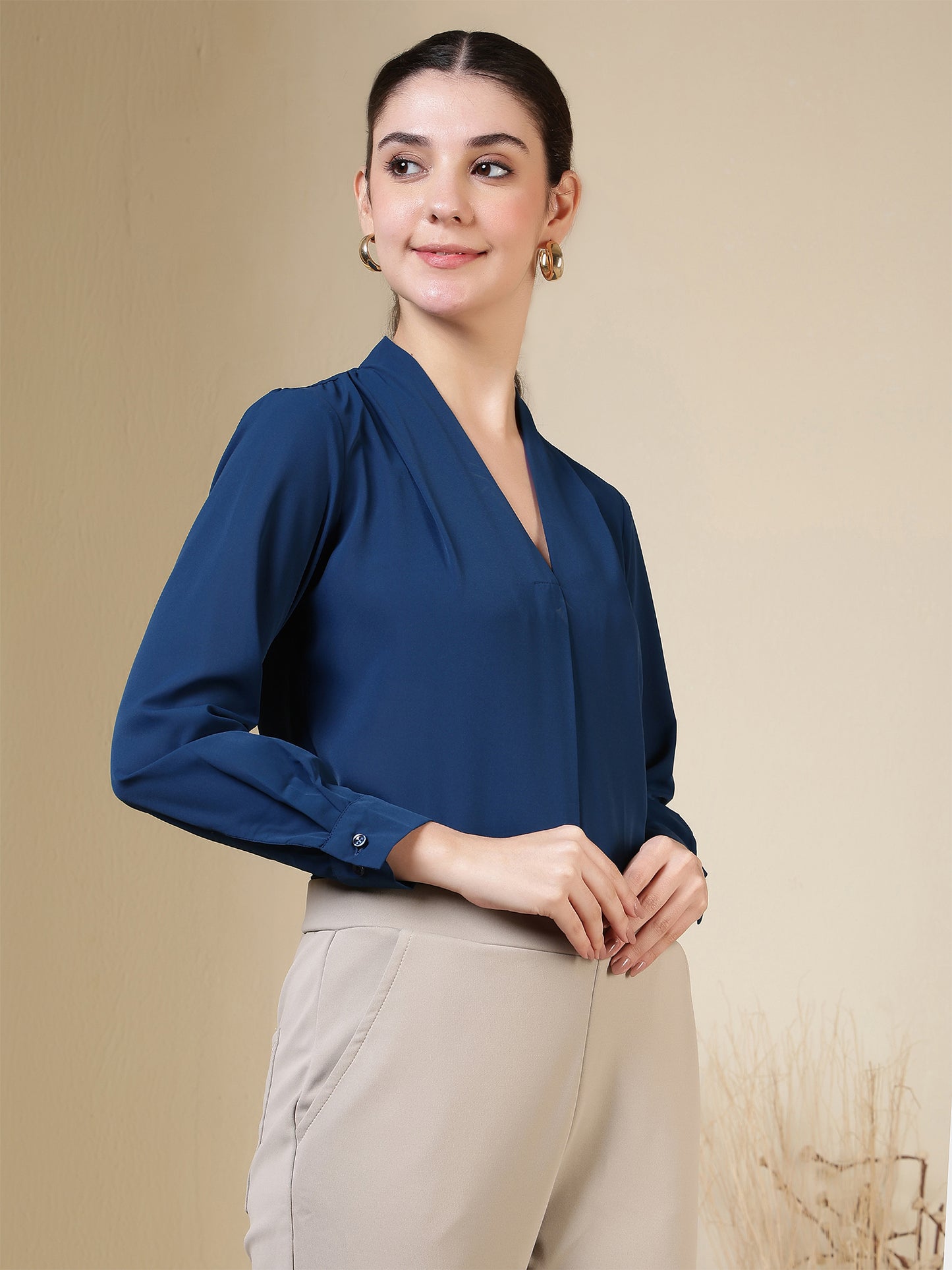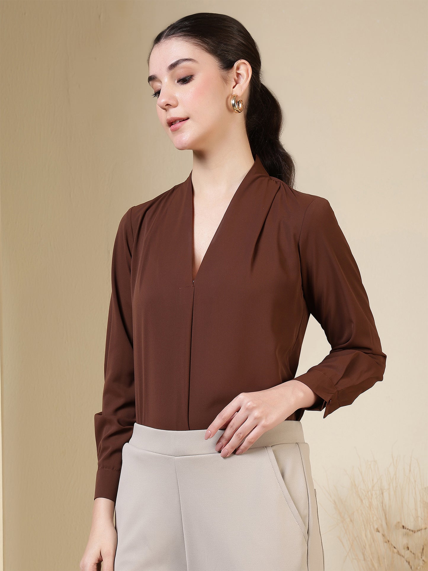 Women’s V-Neck Pleated Long Sleeve Elegant Office Wear & Everyday Casual Top