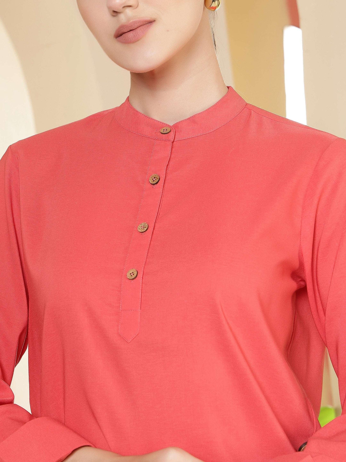 This top features a clean, structured silhouette that offers a refined and polished appeal. Designed with a band collar and a neat buttoned placket, it delivers a timeless look suitable for structured dressing. The full sleeves enhance its formal character, while the straight hem ensures a flattering and comfortable fit. Crafted for ease of movement and all-day comfort, this versatile style pairs effortlessly with trousers or tailored bottoms, making it an ideal choice for workwear, meetings, and smart daytime occasions.