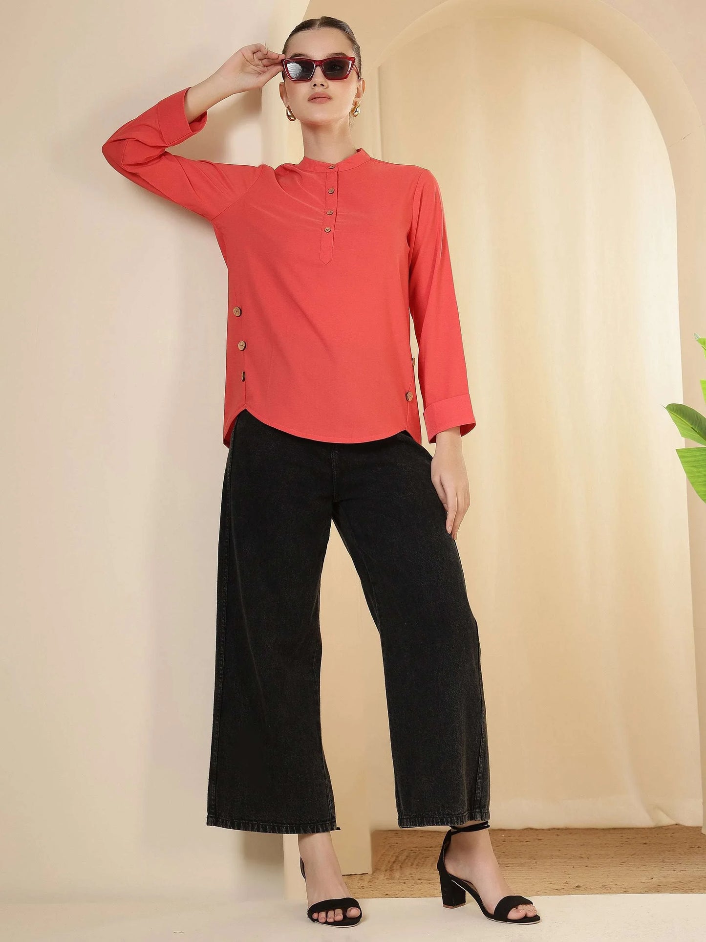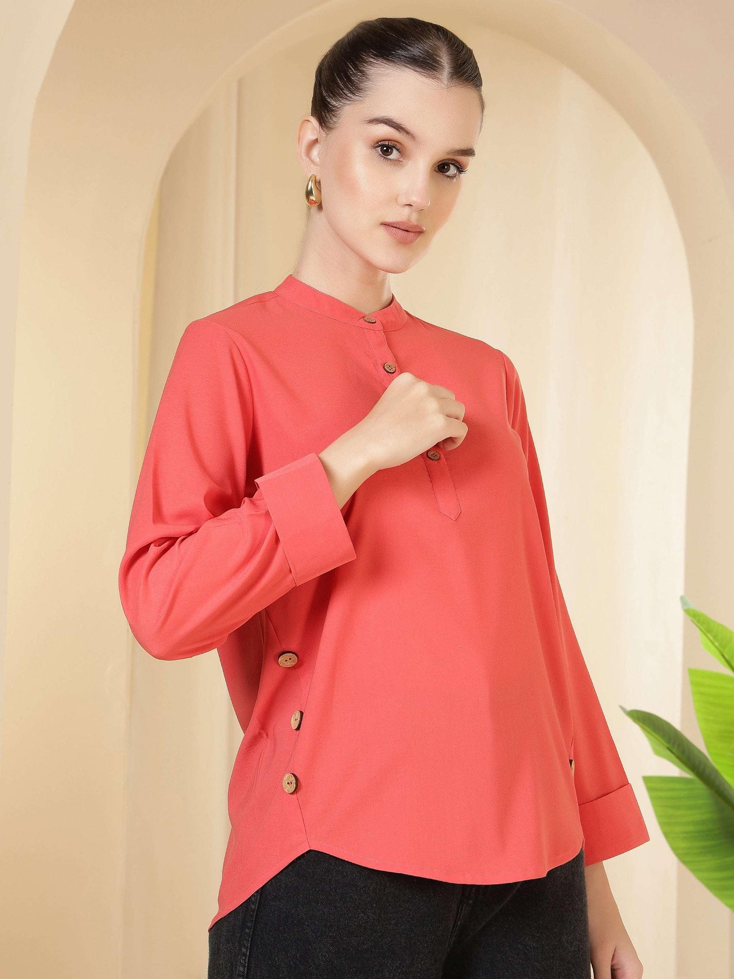 Regular price Rs. 699.00This top features a clean, structured silhouette that offers a refined and polished appeal. Designed with a band collar and a neat buttoned placket, it delivers a timeless look suitable for structured dressing. The full sleeves enhance its formal character, while the straight hem ensures a flattering and comfortable fit. Crafted for ease of movement and all-day comfort, this versatile style pairs effortlessly with trousers or tailored bottoms, making it an ideal choice for workwear, meetings, and smart daytime occasions.