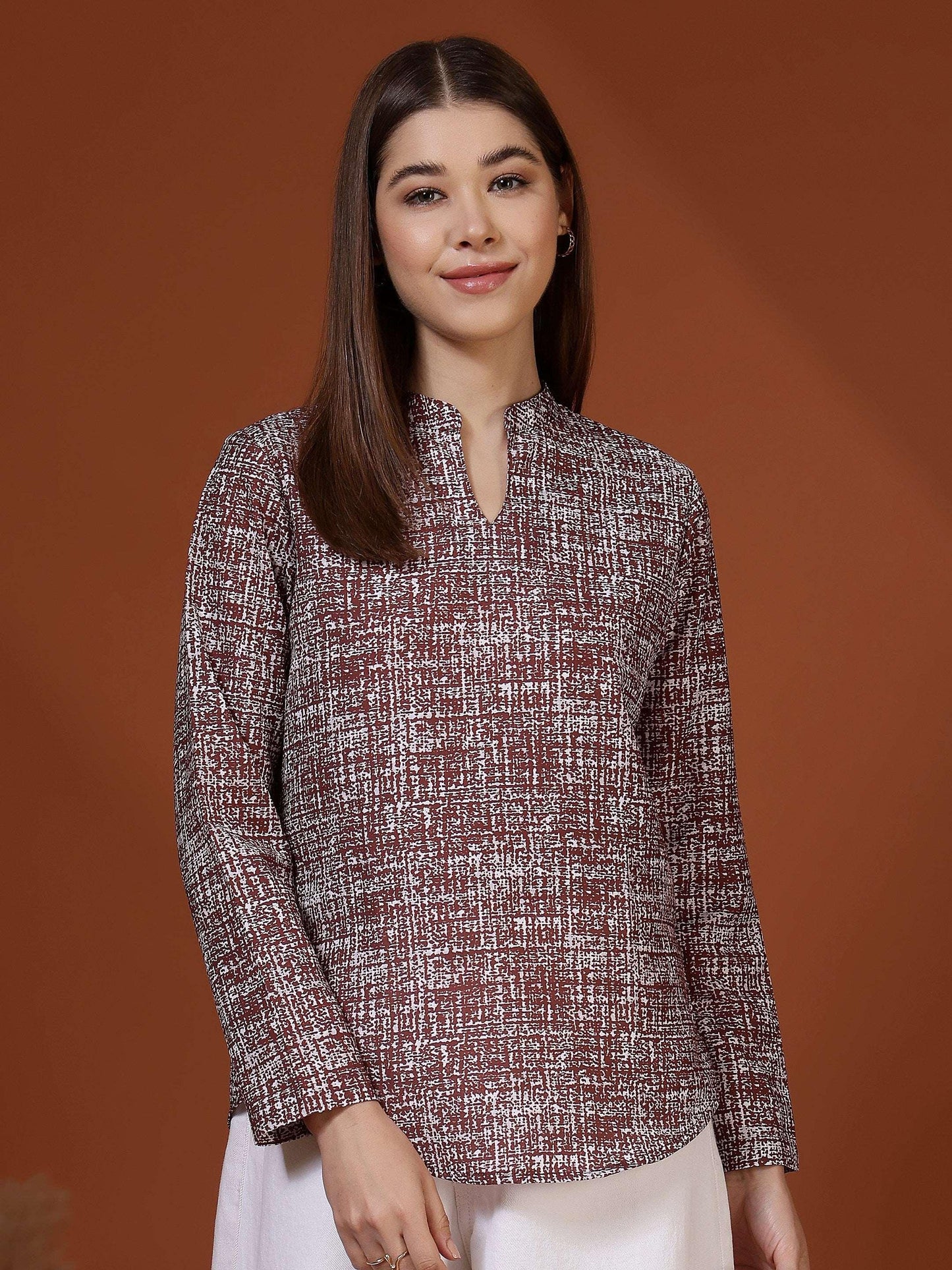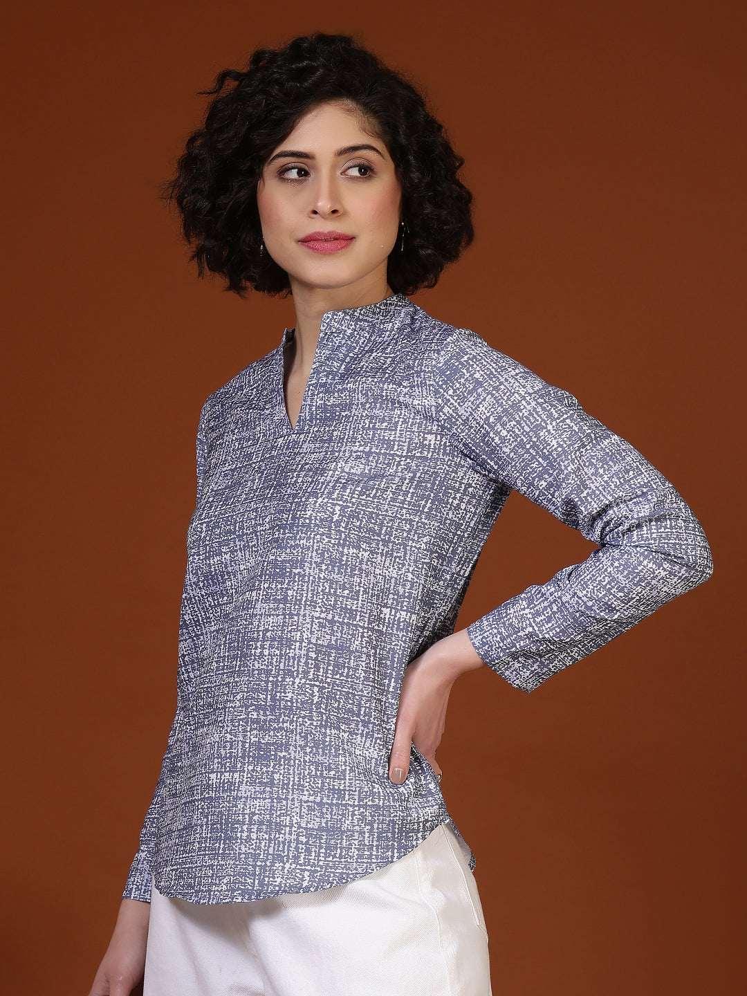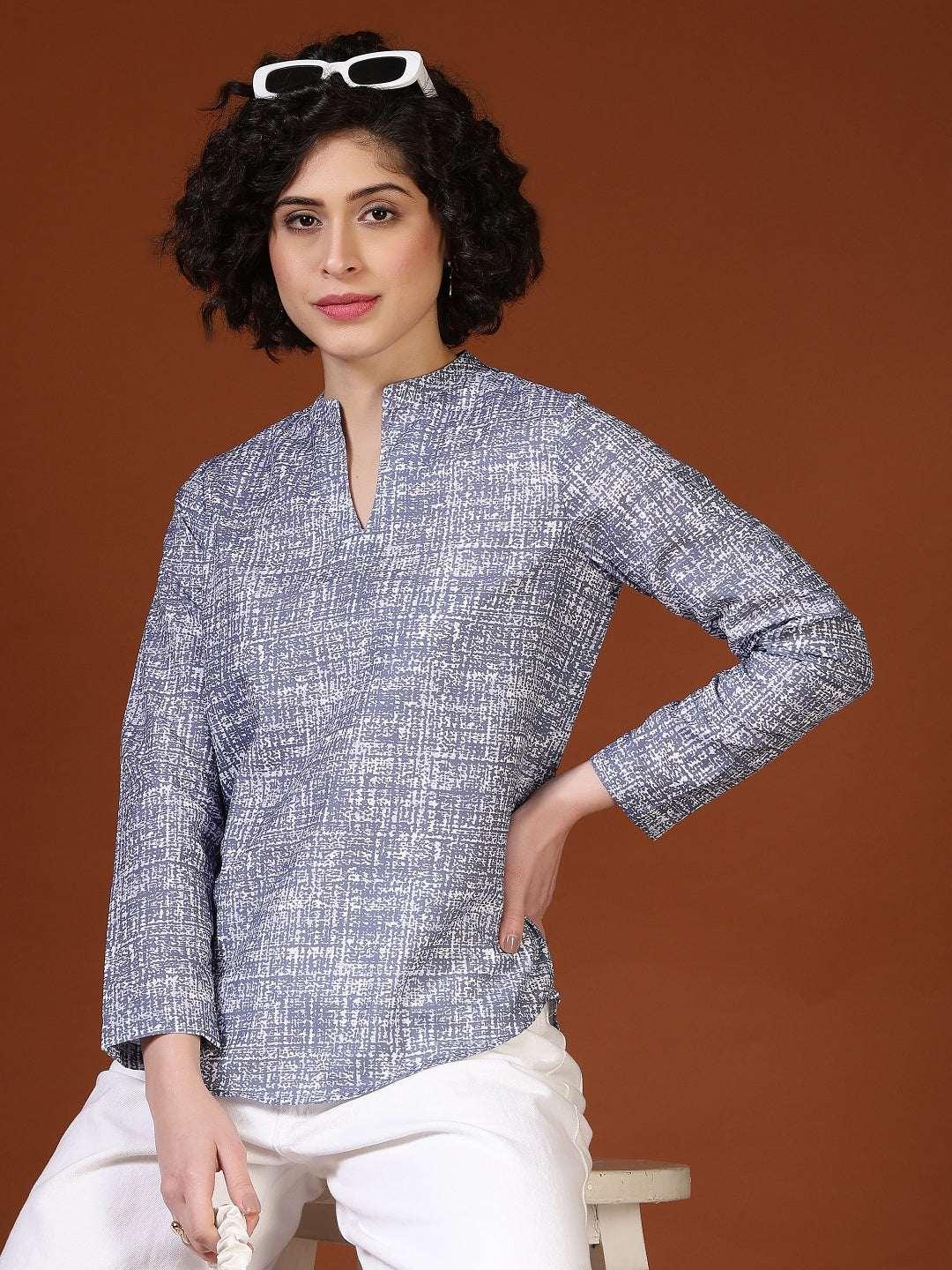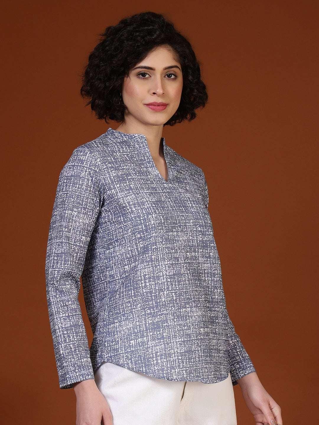 This women’s top features a clean and sophisticated design that makes it ideal for smart casual and semi-formal wear. Styled with a neat band collar and a subtle slit neckline, it offers a polished and refined appearance. The long sleeves and straight silhouette provide a comfortable and flattering fit suitable for all-day wear. Crafted from soft, breathable cotton fabric, the top feels gentle on the skin and ensures ease of movement. Its understated textured pattern adds visual interest without being overpowering, making it perfect for office wear, work meetings, casual Fridays, or everyday professional outings.