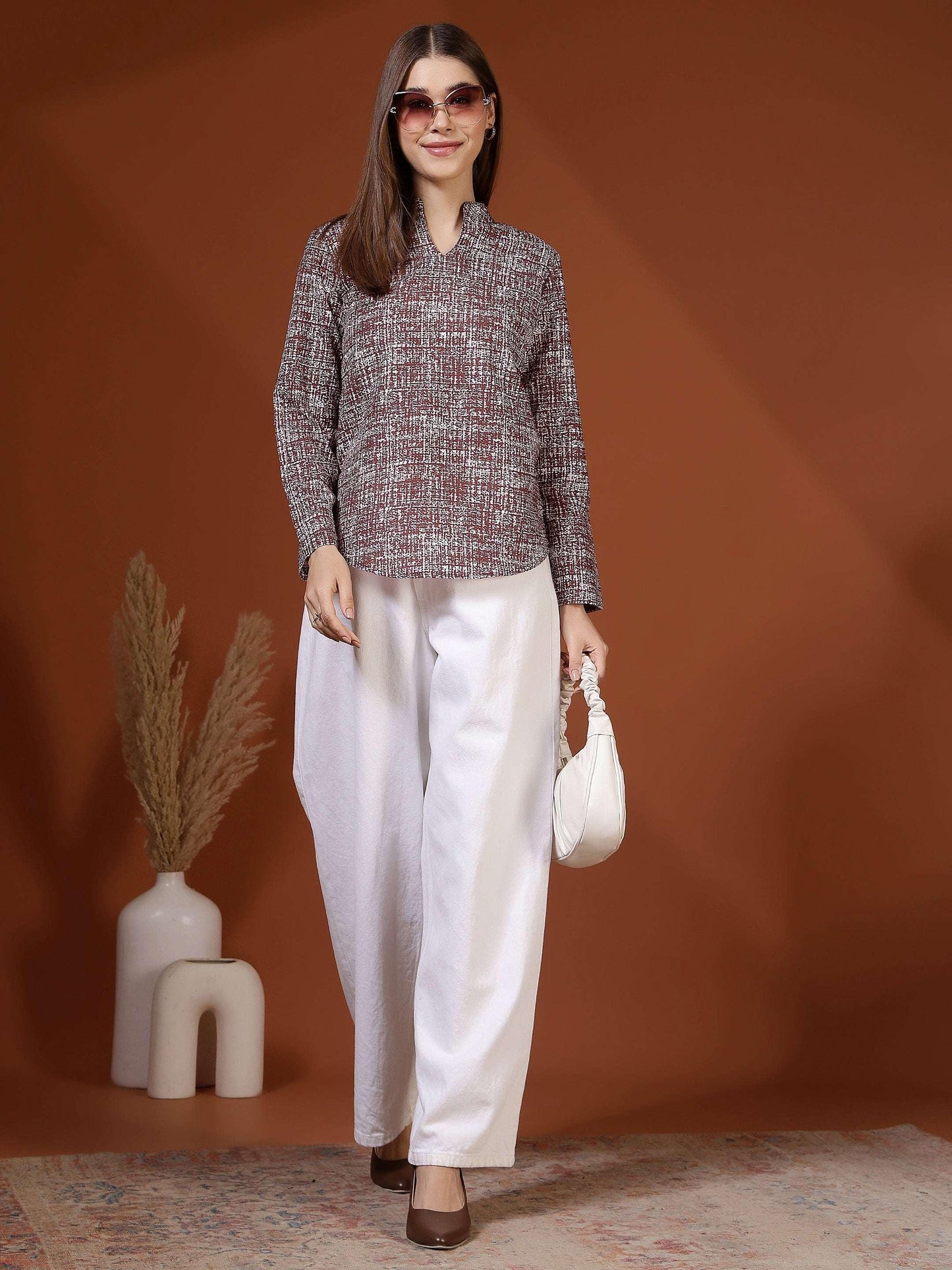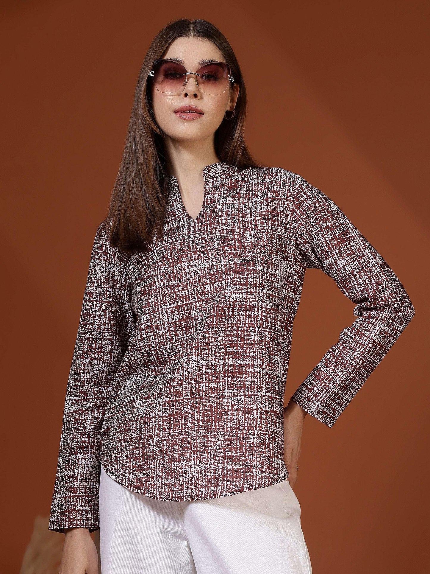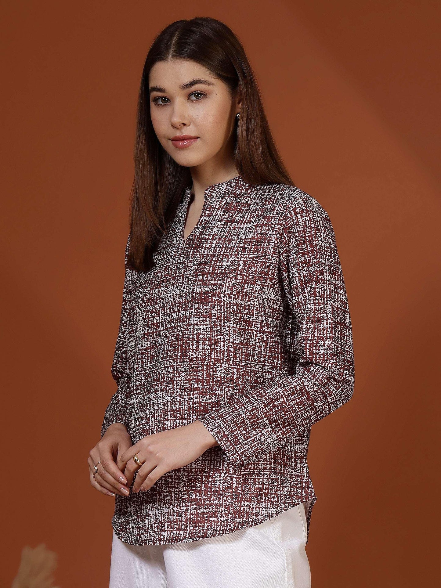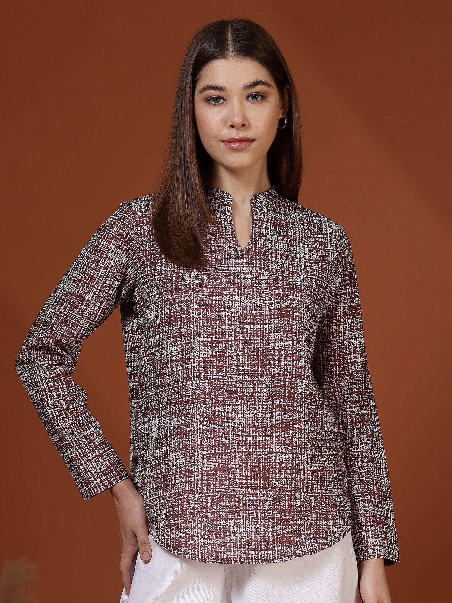This women’s top features a clean and sophisticated design that makes it ideal for smart casual and semi-formal wear. Styled with a neat band collar and a subtle slit neckline, it offers a polished and refined appearance. The long sleeves and straight silhouette provide a comfortable and flattering fit suitable for all-day wear. Crafted from soft, breathable cotton fabric, the top feels gentle on the skin and ensures ease of movement. Its understated textured pattern adds visual interest without being overpowering, making it perfect for office wear, work meetings, casual Fridays, or everyday professional outings.