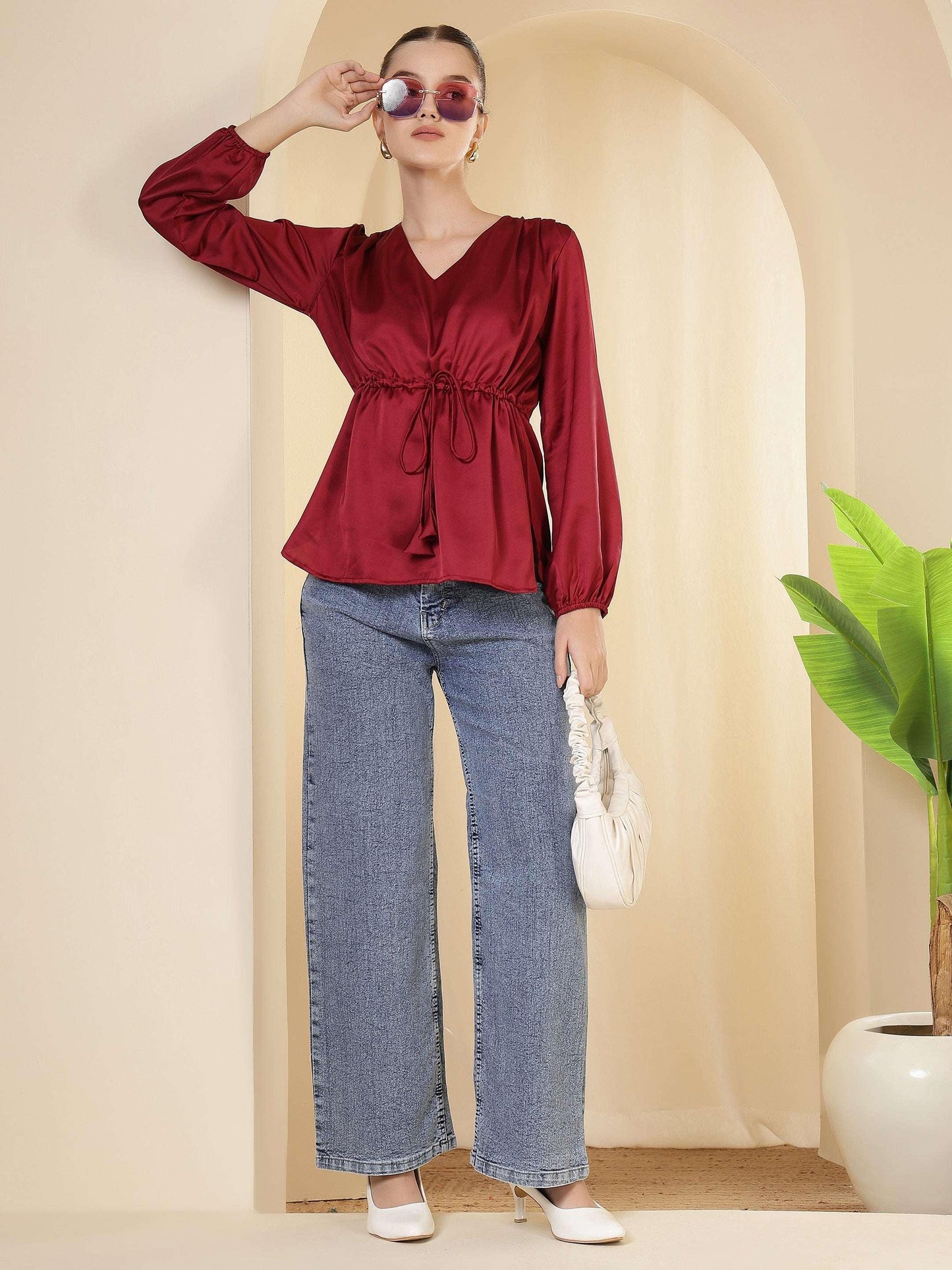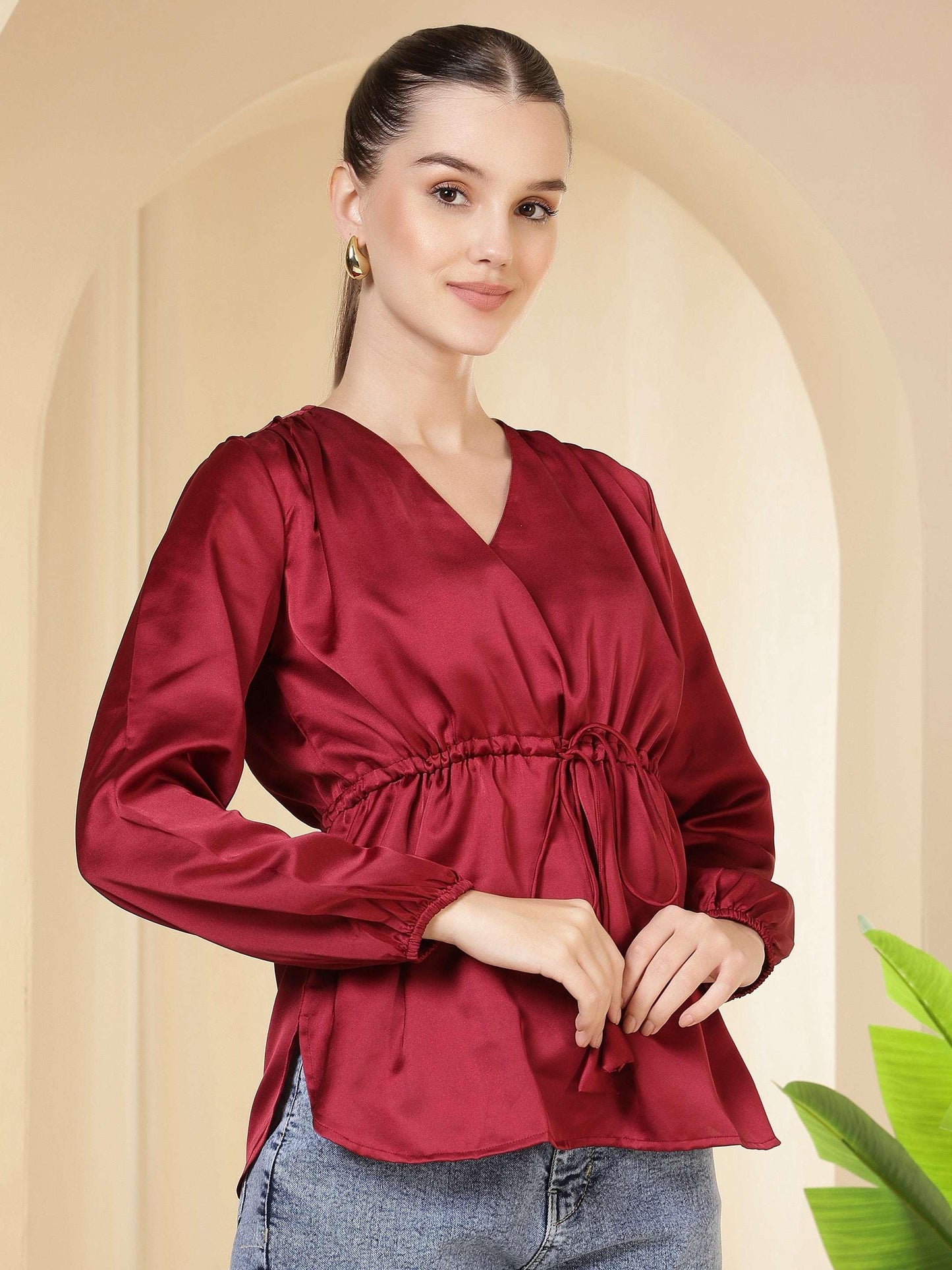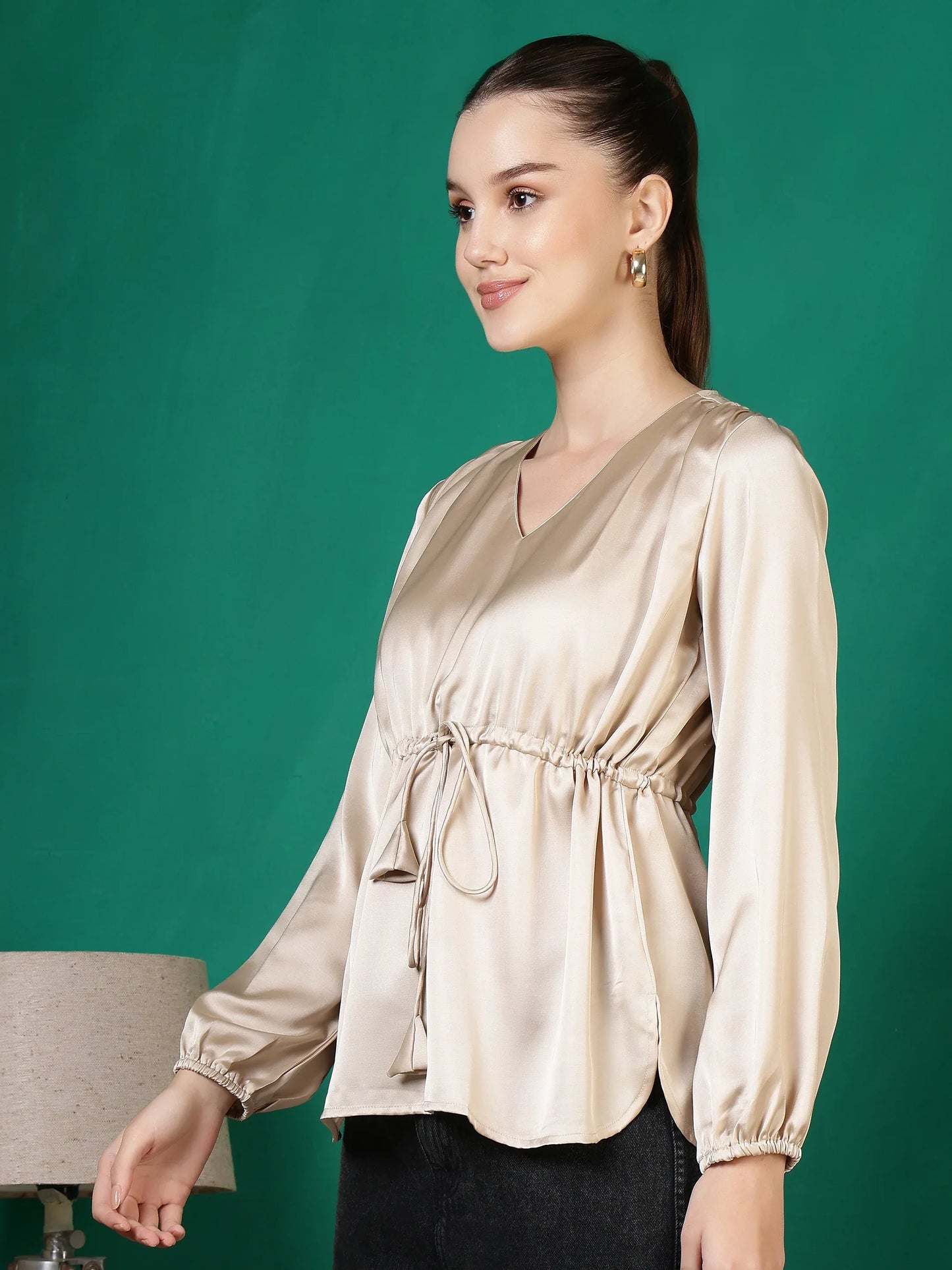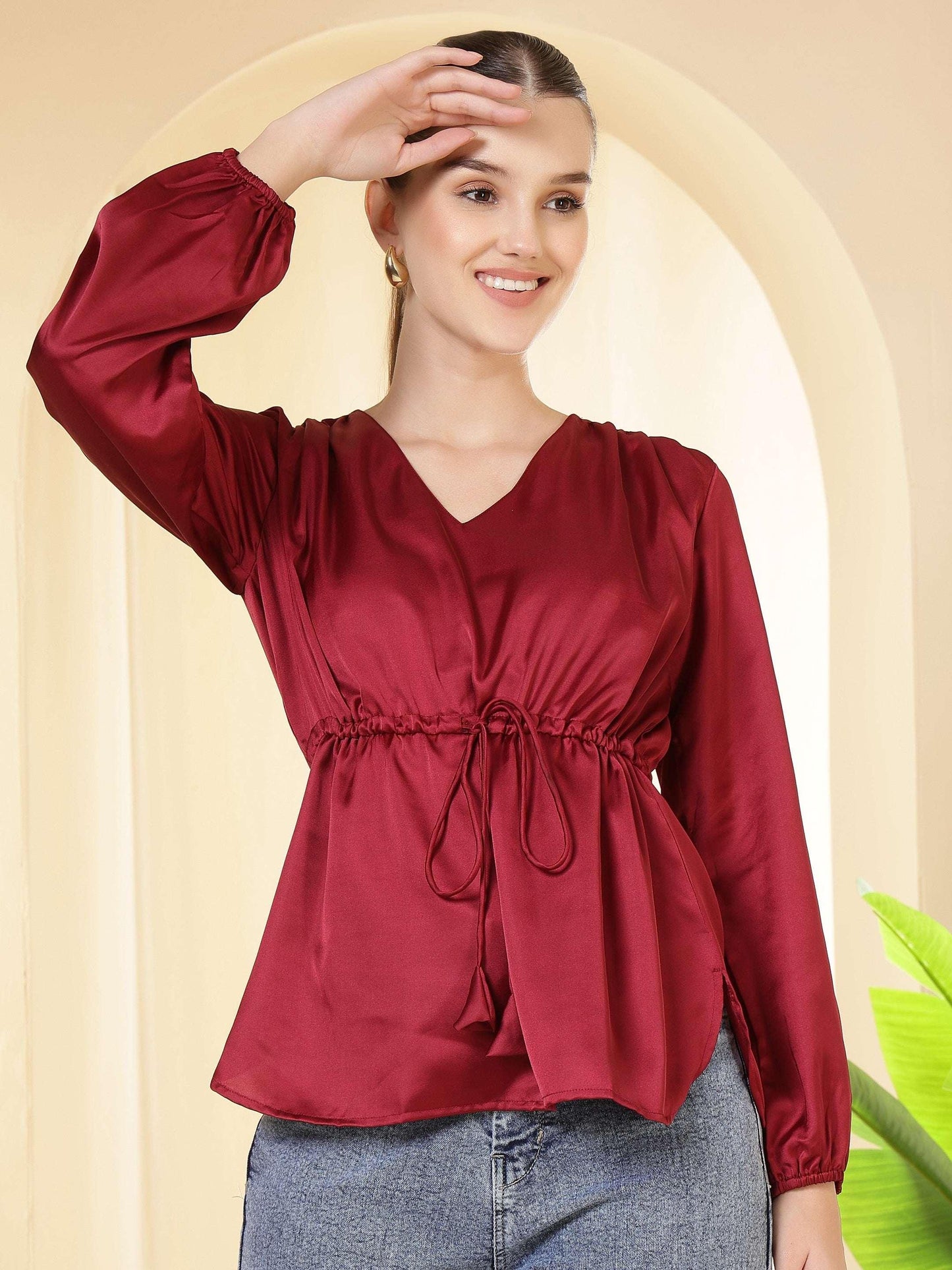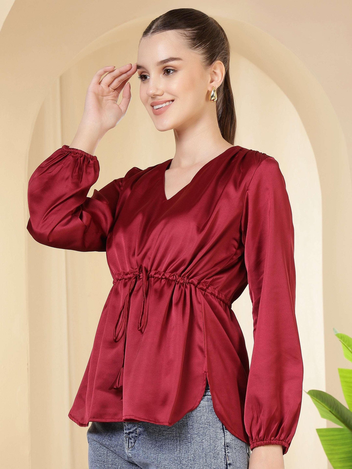 Women V-Neck Tie-Up Waist Wrap Style Top with Bishop Sleeves