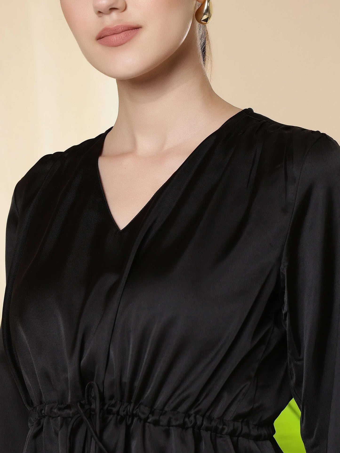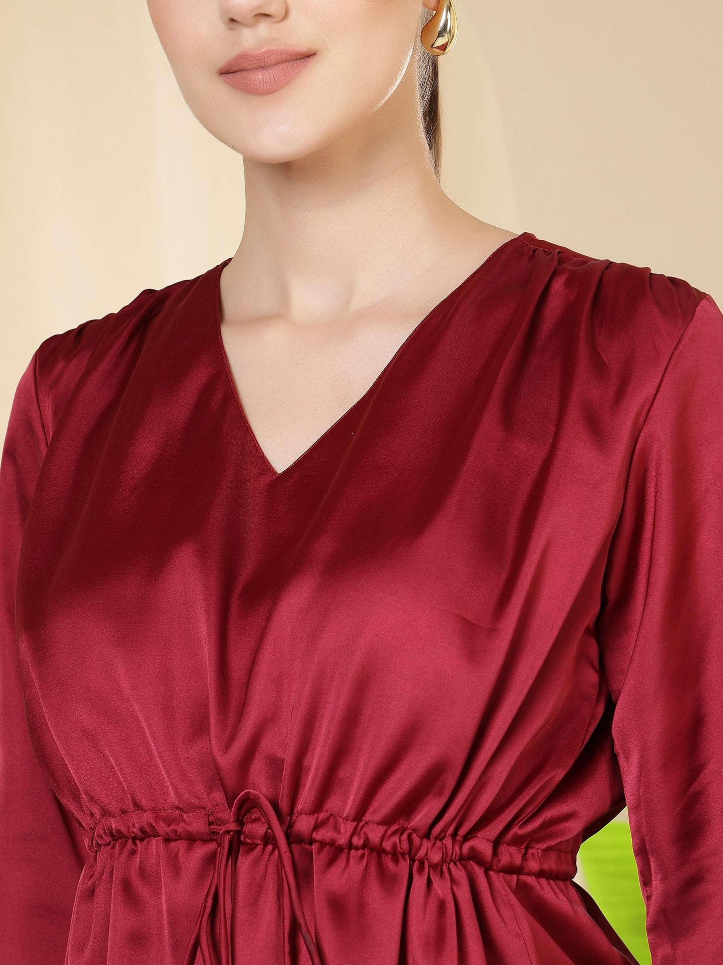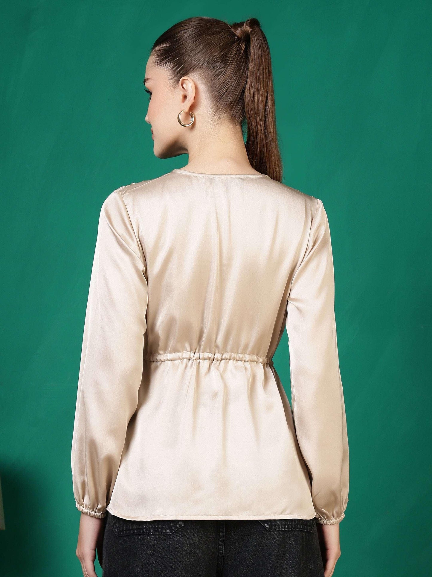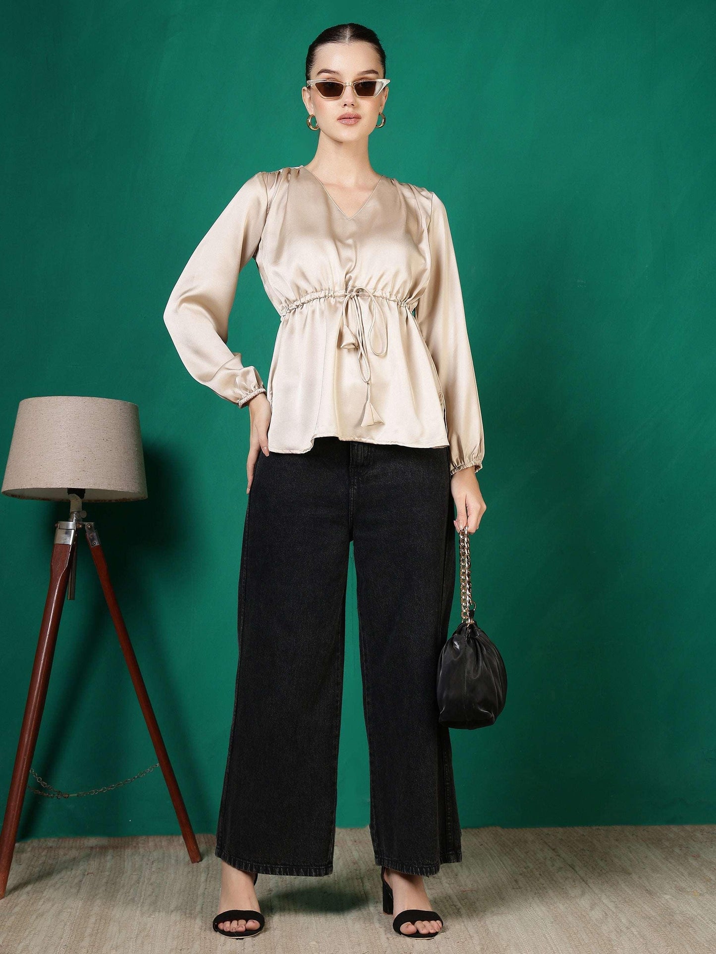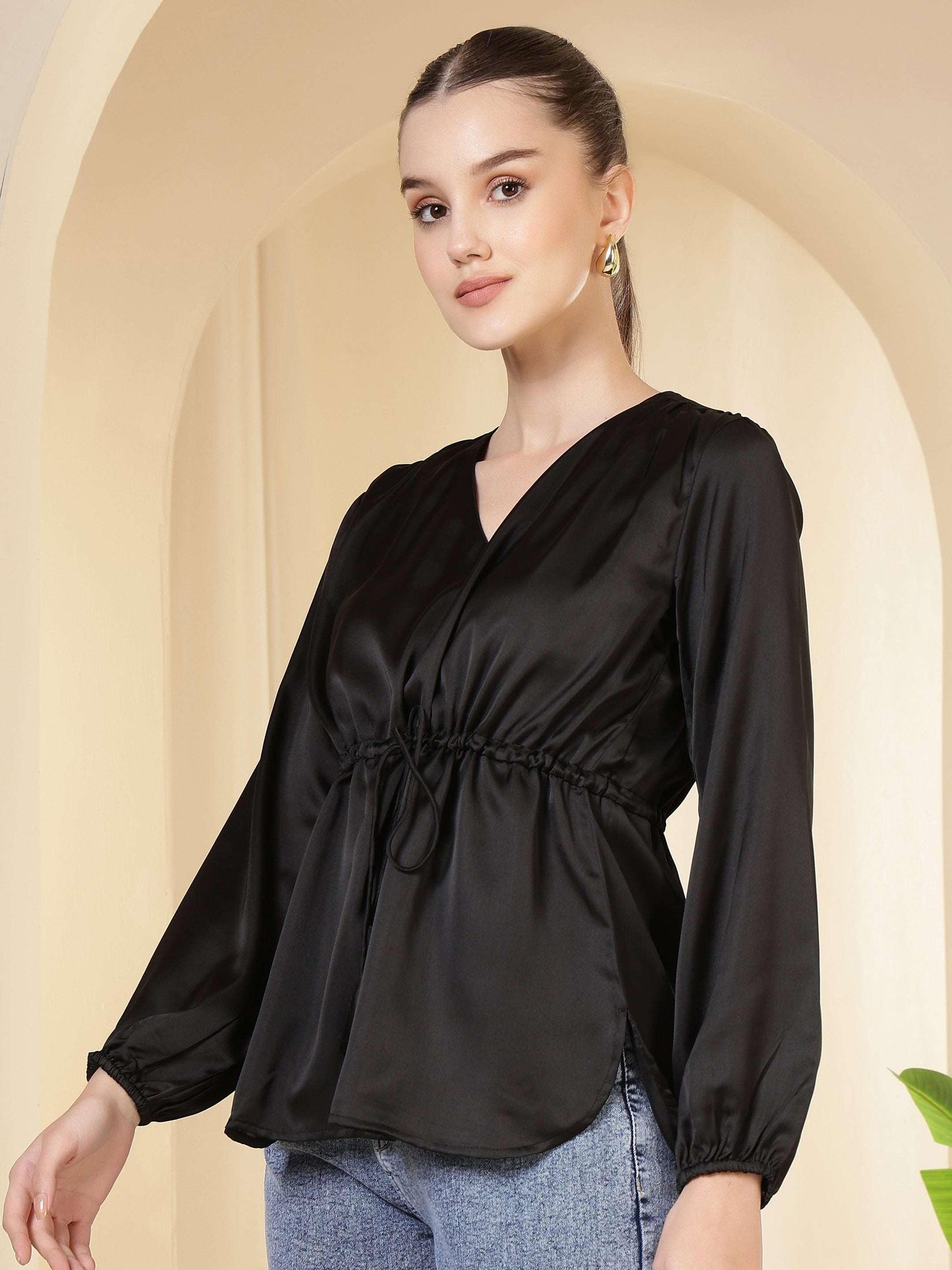 Women V-Neck Tie-Up Waist Wrap Style Top with Bishop Sleeves