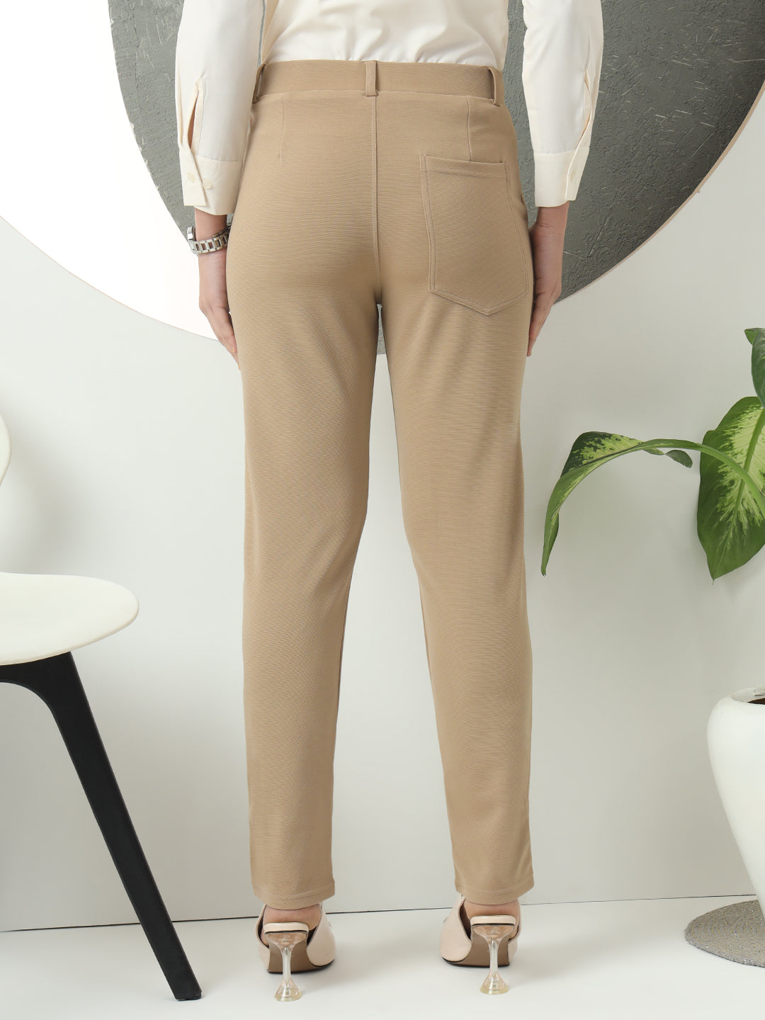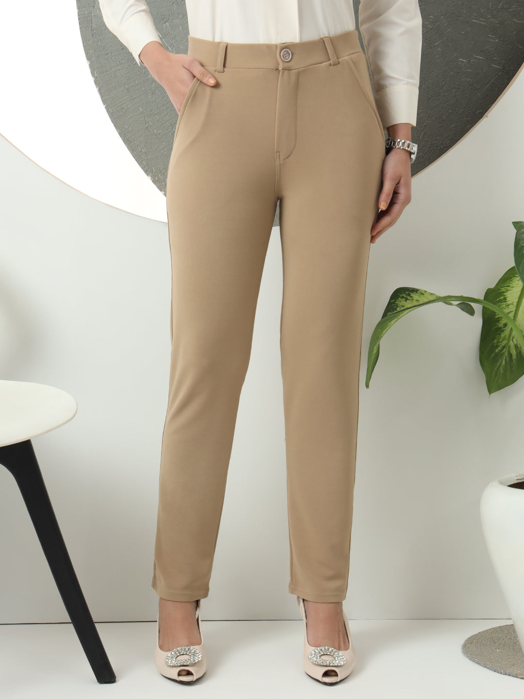 Women Smart Slim Fit High-Rise Formal Trousers. Crafted from a high-quality cotton blend, these trousers offer a perfect balance of comfort and durability. The slim fit design flatters your figure, providing a sleek and polished look that is ideal for any formal setting. The high-rise waist adds to the appeal by offering a comfortable and secure fit, while also enhancing the silhouette, making these trousers a must-have for the modern woman. Designed for versatility, these trousers can be paired with shirts, blouses, or blazers, making them an excellent choice for both professional and semi-casual outfits. Whether you’re heading to an important meeting, a corporate event, or simply looking for a sophisticated daily office outfit, these trousers deliver on both style and comfort. The Cement color adds a contemporary touch, offering a neutral yet chic shade that pairs well with a variety of colors and patterns. The fabric is breathable, ensuring that you stay comfortable during long workdays or events. Plus, the durable cotton blend ensures longevity, even after repeated use and washes. Whether you're working in a corporate environment or attending formal events, these high-rise, slim-fit trousers are the perfect addition to your wardrobe. Elevate your style with these elegant and functional trousers, designed to make you look sharp and feel confident.