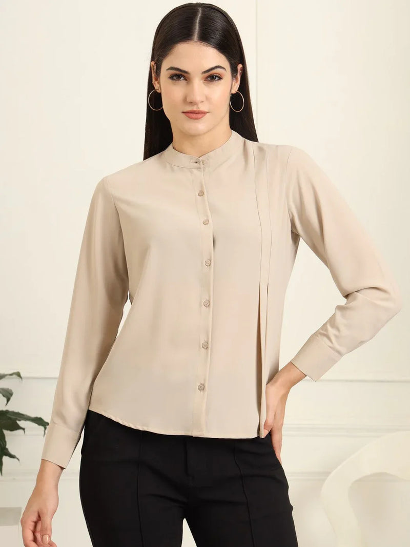 Women's Standard Solid Mandarin Collar Casual Shirt, designed for women who value both style and comfort. This versatile shirt offers a chic Mandarin collar that sets it apart from your regular casual tops. The collar adds a sophisticated and contemporary touch, making it the perfect piece for office wear, business meetings, and casual outings alike. Made from a soft and durable polycotton blend, this shirt offers a luxurious feel against your skin while maintaining its structure and elegance throughout the day. The breathable nature of polycotton ensures that you stay cool and comfortable, no matter the weather or occasion. Whether you're attending a formal event or enjoying a laid-back weekend, this shirt has you covered. Featuring regular sleeves, this shirt provides just the right amount of structure and flexibility, allowing you to wear it all day without feeling restricted. Its design is ideal for pairing with anything from high-rise trousers for a polished, professional look to jeans for a casual day out. This versatility makes it an essential piece in any woman's wardrobe. The shirt comes in classic solid colors: Black, White, and Cream. These neutral shades not only look great with a variety of outfits but also make styling easier. Pair the Black shirt with tailored pants for a bold, sleek office look, or opt for the White shirt when you want a fresh, crisp appearance. One of the standout features of this shirt is its dual-purpose design. It can easily transition between casual and formal occasions, making it an incredibly functional addition to your collection. Wear it to work for a clean, professional look, and keep it on for after-work gatherings or weekend outings without missing a beat. Designed with attention to both form and function, this Mandarin collar casual shirt is an effortless blend of modern style and timeless elegance.
