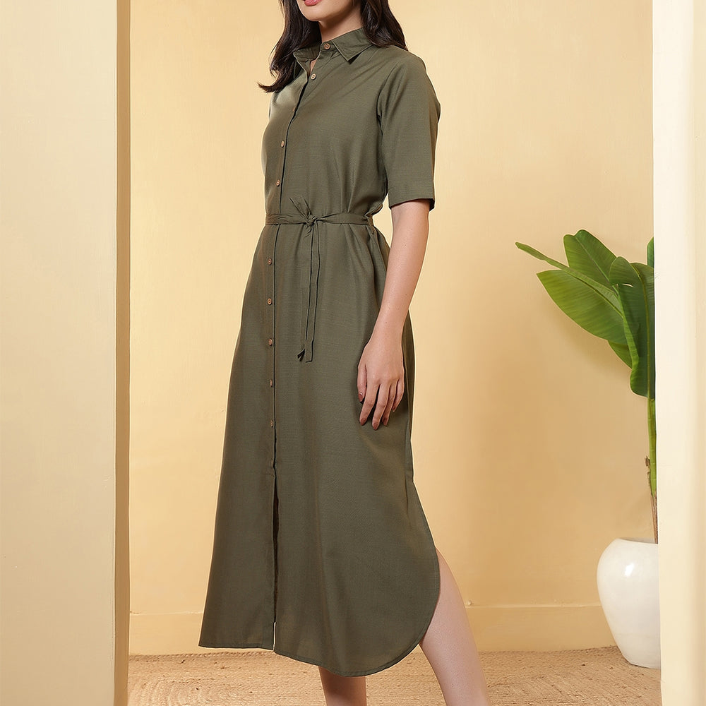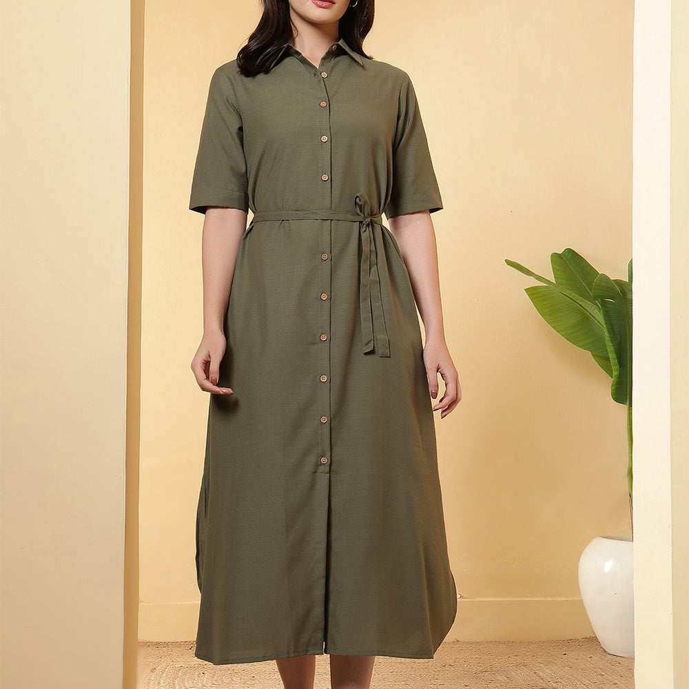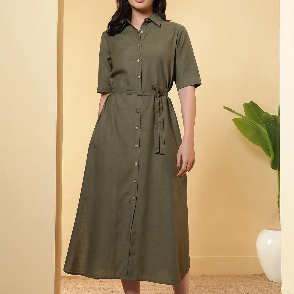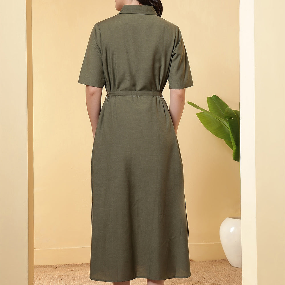 This solid Dress is designed by FITHUB FASHION in a beautiful pattern for casual, wedding, and party occasions. You can wear this for special occasions as well and look amazing. The tie-up waist belt allows you to adjust the fit as per your preference, giving you a flattering silhouette and enhancing your feminine charm. The shirt collar neckline combined with short sleeves makes this maxi dress an ideal choice for multiple occasions; you can wear it to the office, brunch, weekend getaways, or even as evening wear. Available in two versatile shades, Olive and Black, this dress can be styled in countless ways. The classic Black is a wardrobe essential, suitable for formal or party events, while the Olive shade offers a trendy yet subtle look for casual outings. Pair it with heels, flats, or sneakers, depending on your style mood. Crafted with a focus on regular fit and easy wear, this maxi dress ensures comfort throughout the day. The breathable fabric and timeless design make it a must-have for every woman’s wardrobe. Whether you are dressing up for a casual gathering, office wear, or special occasions, this maxi dress provides the right mix of sophistication and ease.