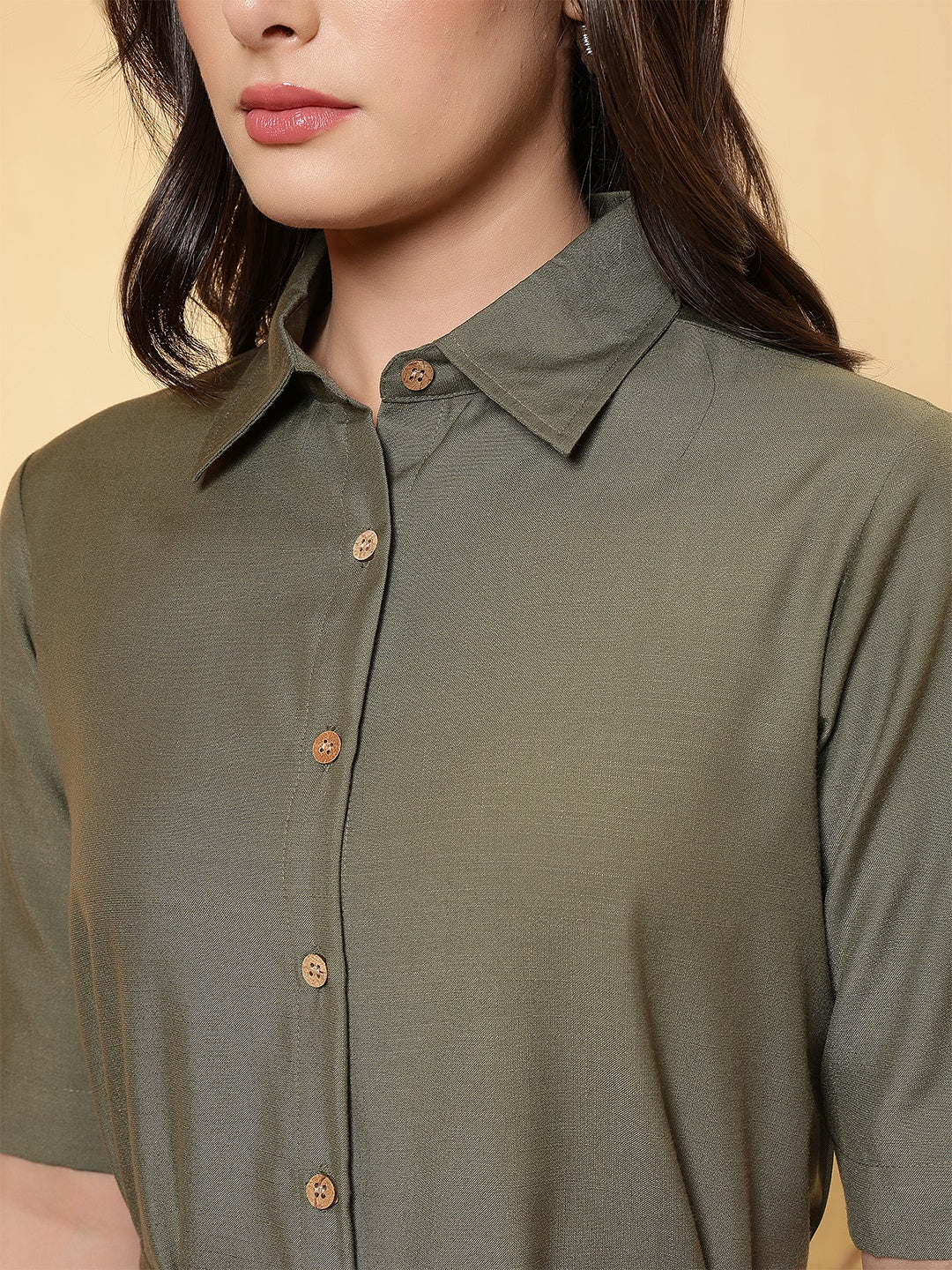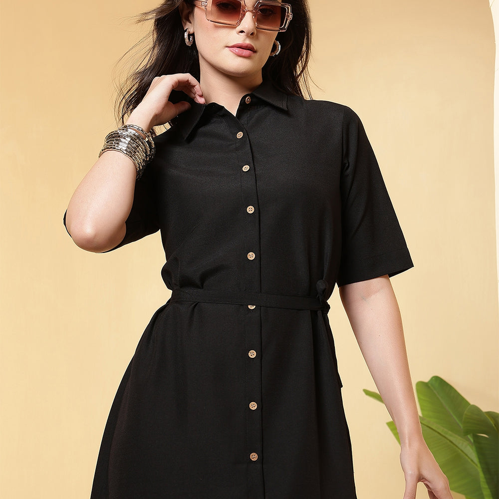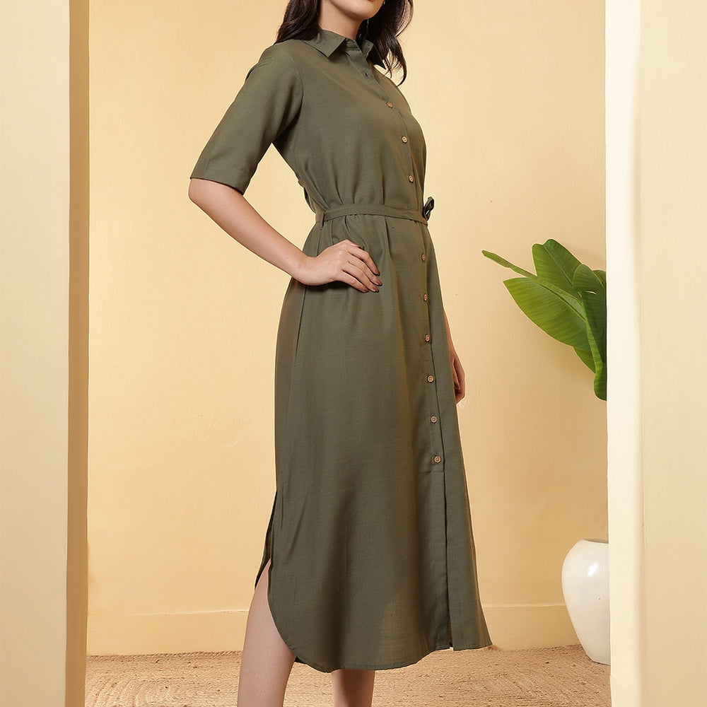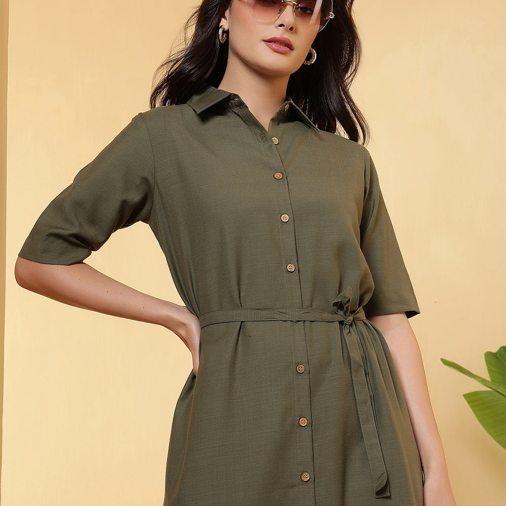 This solid Dress is designed by FITHUB FASHION in a beautiful pattern for casual, wedding, and party occasions. You can wear this for special occasions as well and look amazing. The tie-up waist belt allows you to adjust the fit as per your preference, giving you a flattering silhouette and enhancing your feminine charm. The shirt collar neckline combined with short sleeves makes this maxi dress an ideal choice for multiple occasions; you can wear it to the office, brunch, weekend getaways, or even as evening wear. Available in two versatile shades, Olive and Black, this dress can be styled in countless ways. The classic Black is a wardrobe essential, suitable for formal or party events, while the Olive shade offers a trendy yet subtle look for casual outings. Pair it with heels, flats, or sneakers, depending on your style mood. Crafted with a focus on regular fit and easy wear, this maxi dress ensures comfort throughout the day. The breathable fabric and timeless design make it a must-have for every woman’s wardrobe. Whether you are dressing up for a casual gathering, office wear, or special occasions, this maxi dress provides the right mix of sophistication and ease.
