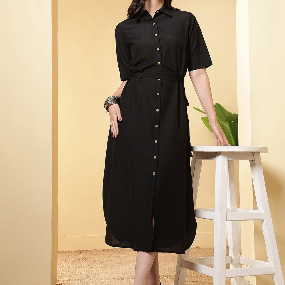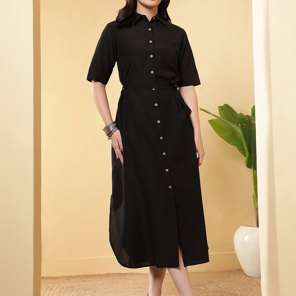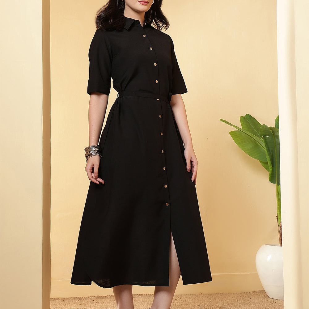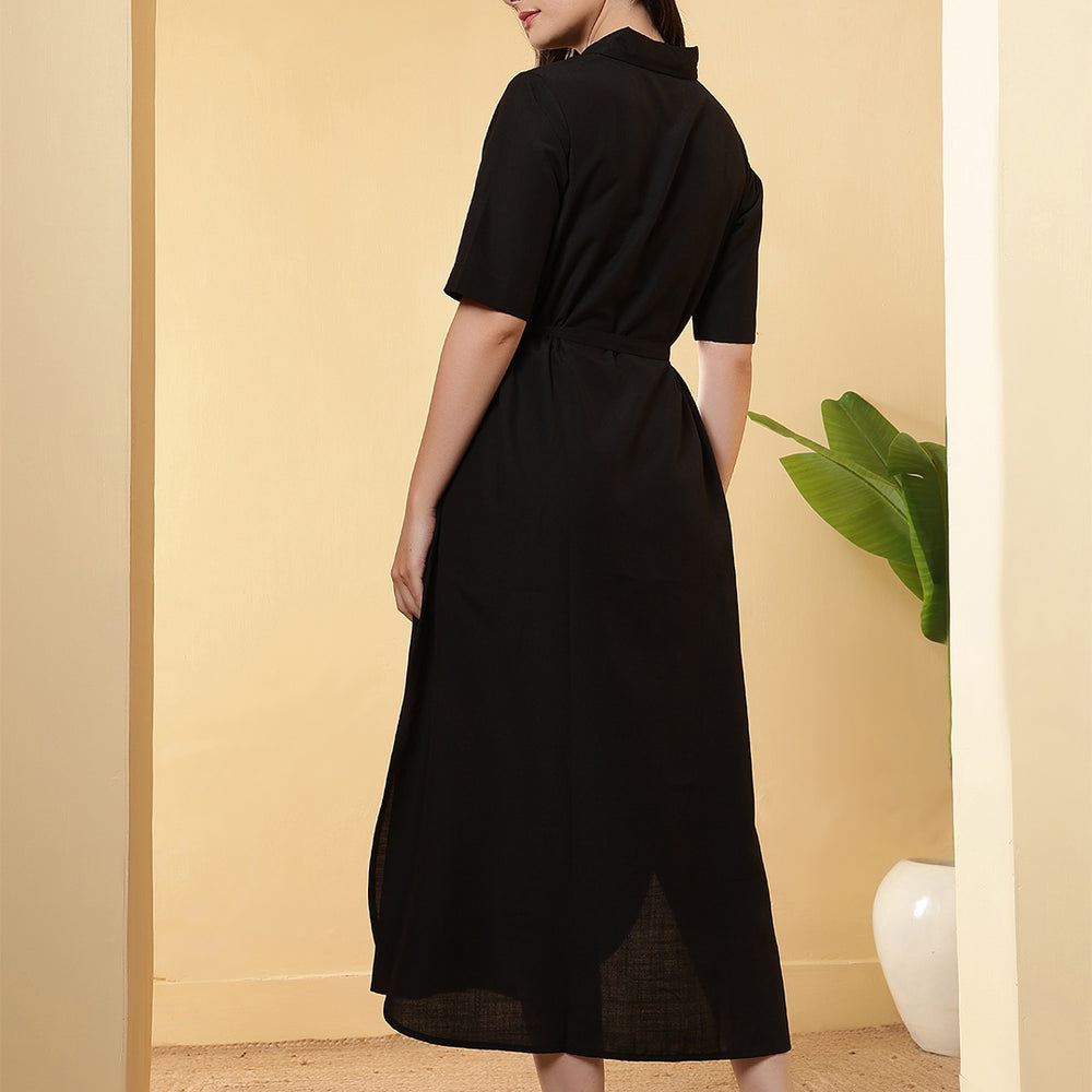 Regular price Rs. 999.00This solid Dress is designed by FITHUB FASHION in a beautiful pattern for casual, wedding, and party occasions. You can wear this for special occasions as well and look amazing. The tie-up waist belt allows you to adjust the fit as per your preference, giving you a flattering silhouette and enhancing your feminine charm. The shirt collar neckline combined with short sleeves makes this maxi dress an ideal choice for multiple occasions; you can wear it to the office, brunch, weekend getaways, or even as evening wear. Available in two versatile shades, Olive and Black, this dress can be styled in countless ways. The classic Black is a wardrobe essential, suitable for formal or party events, while the Olive shade offers a trendy yet subtle look for casual outings. Pair it with heels, flats, or sneakers, depending on your style mood. Crafted with a focus on regular fit and easy wear, this maxi dress ensures comfort throughout the day. The breathable fabric and timeless design make it a must-have for every woman’s wardrobe. Whether you are dressing up for a casual gathering, office wear, or special occasions, this maxi dress provides the right mix of sophistication and ease.