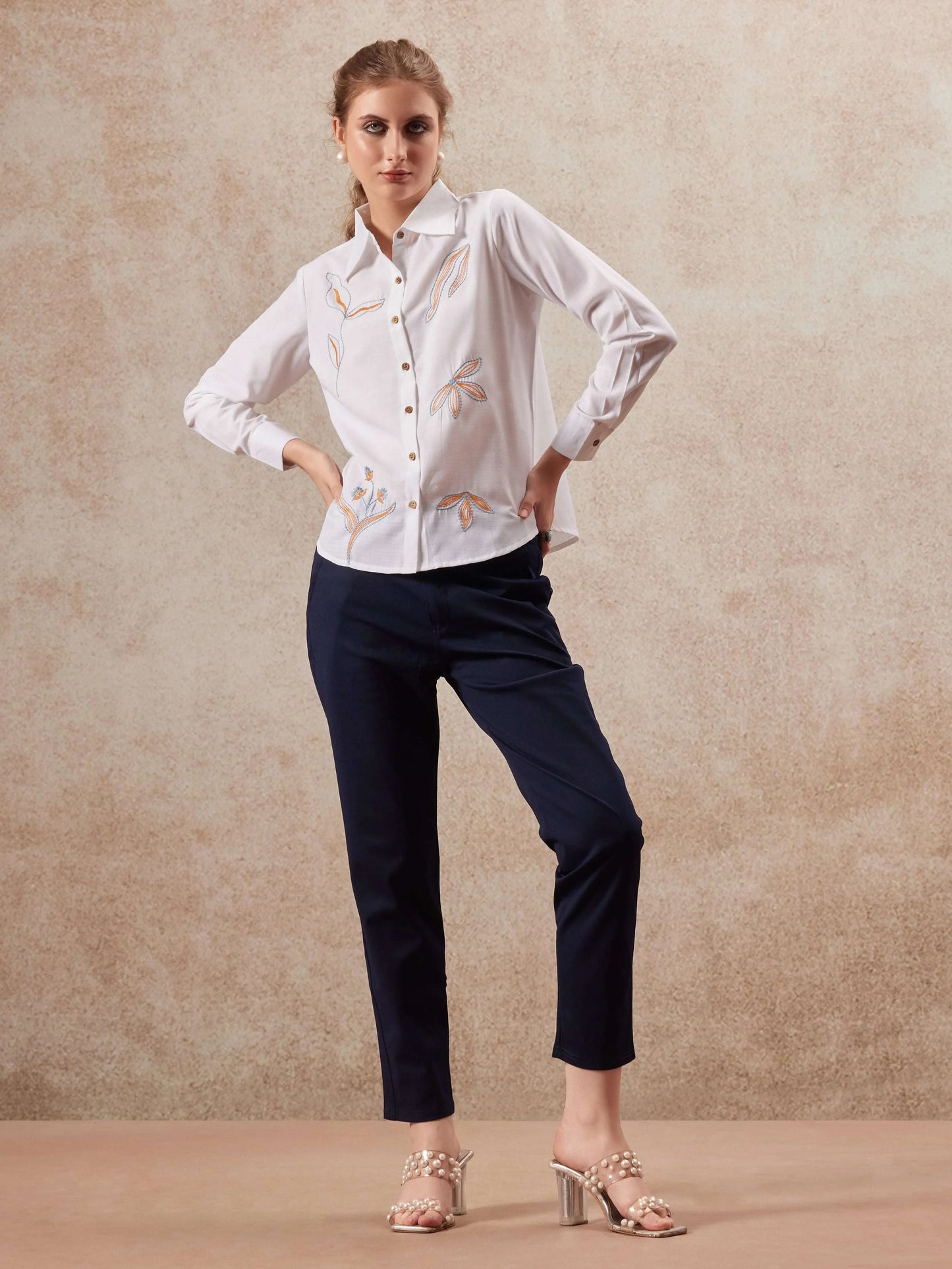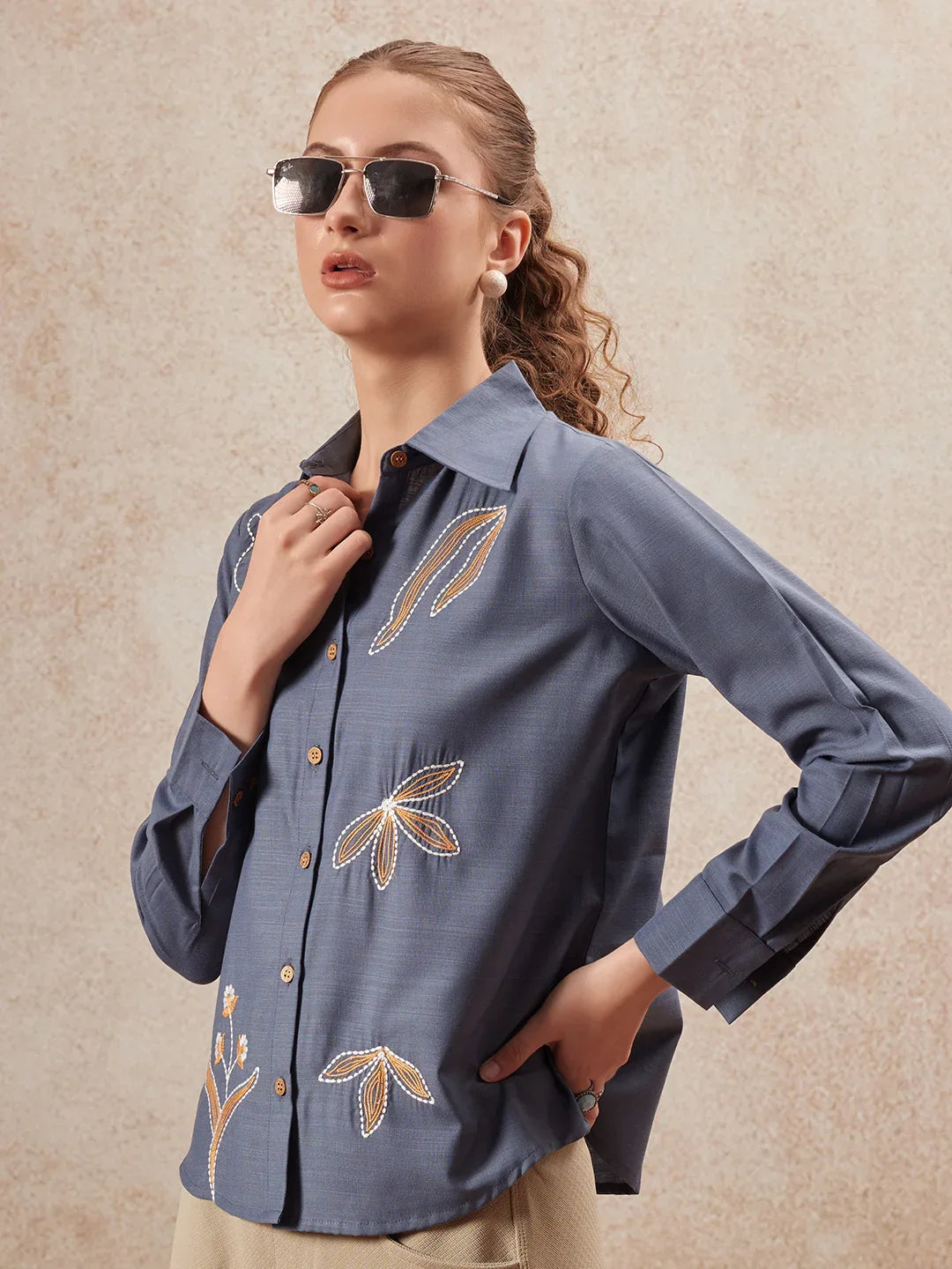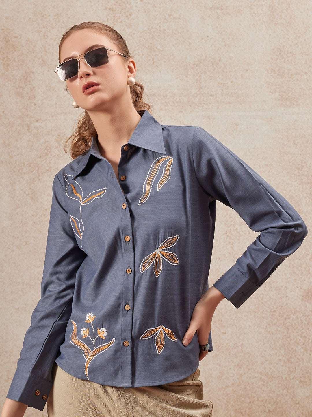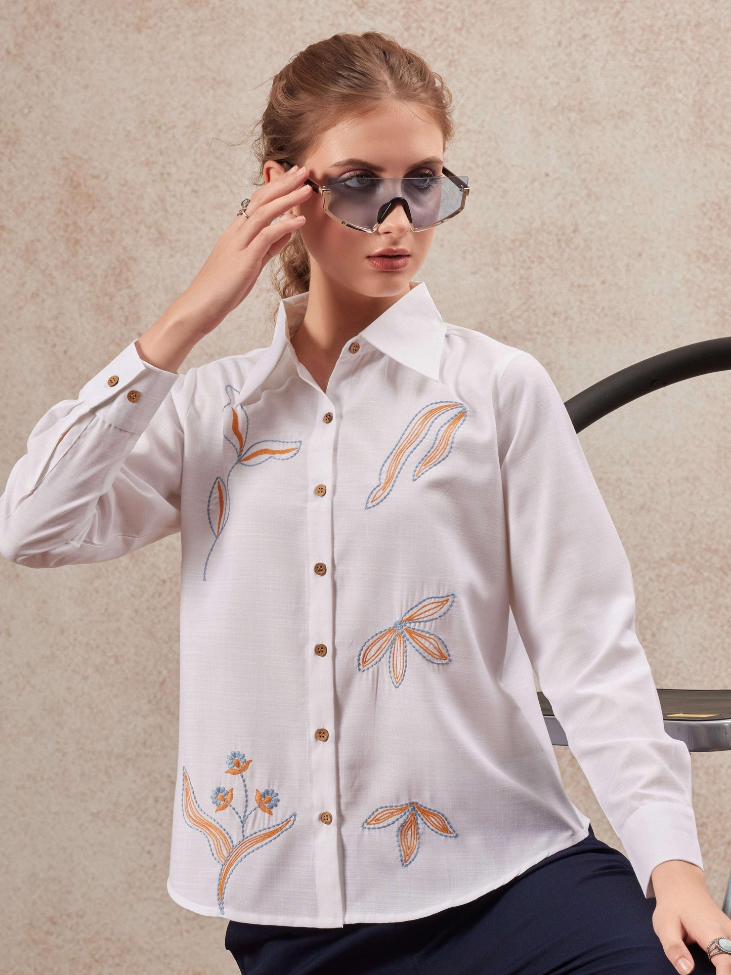 This women’s embroidered shirt is thoughtfully designed to blend everyday comfort with refined style, making it a versatile addition to your wardrobe. Crafted from soft, breathable fabric, it offers a smooth feel against the skin while ensuring all-day ease. The classic collared neckline and full button-down front create a timeless silhouette that works effortlessly for both casual and semi-formal settings. Delicate embroidery details placed across the front add an elegant, handcrafted touch, enhancing the overall look without appearing overpowering. The full-length sleeves with structured cuffs provide a polished finish, while the regular fit allows comfortable movement and a flattering drape on different body types. Easy to style, this shirt pairs beautifully with trousers, skirts, or denim, making it suitable for office wear, casual outings, or smart everyday dressing. Designed for women who appreciate subtle detailing and versatile fashion, this embroidered shirt delivers a perfect balance of sophistication, comfort, and modern appeal.