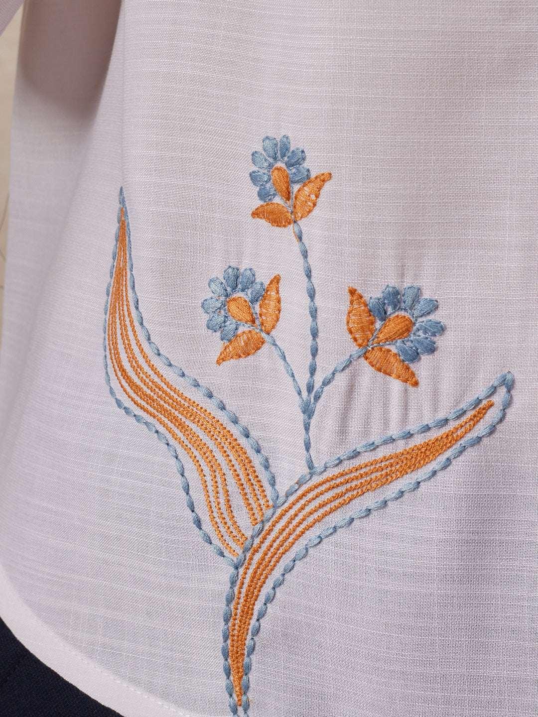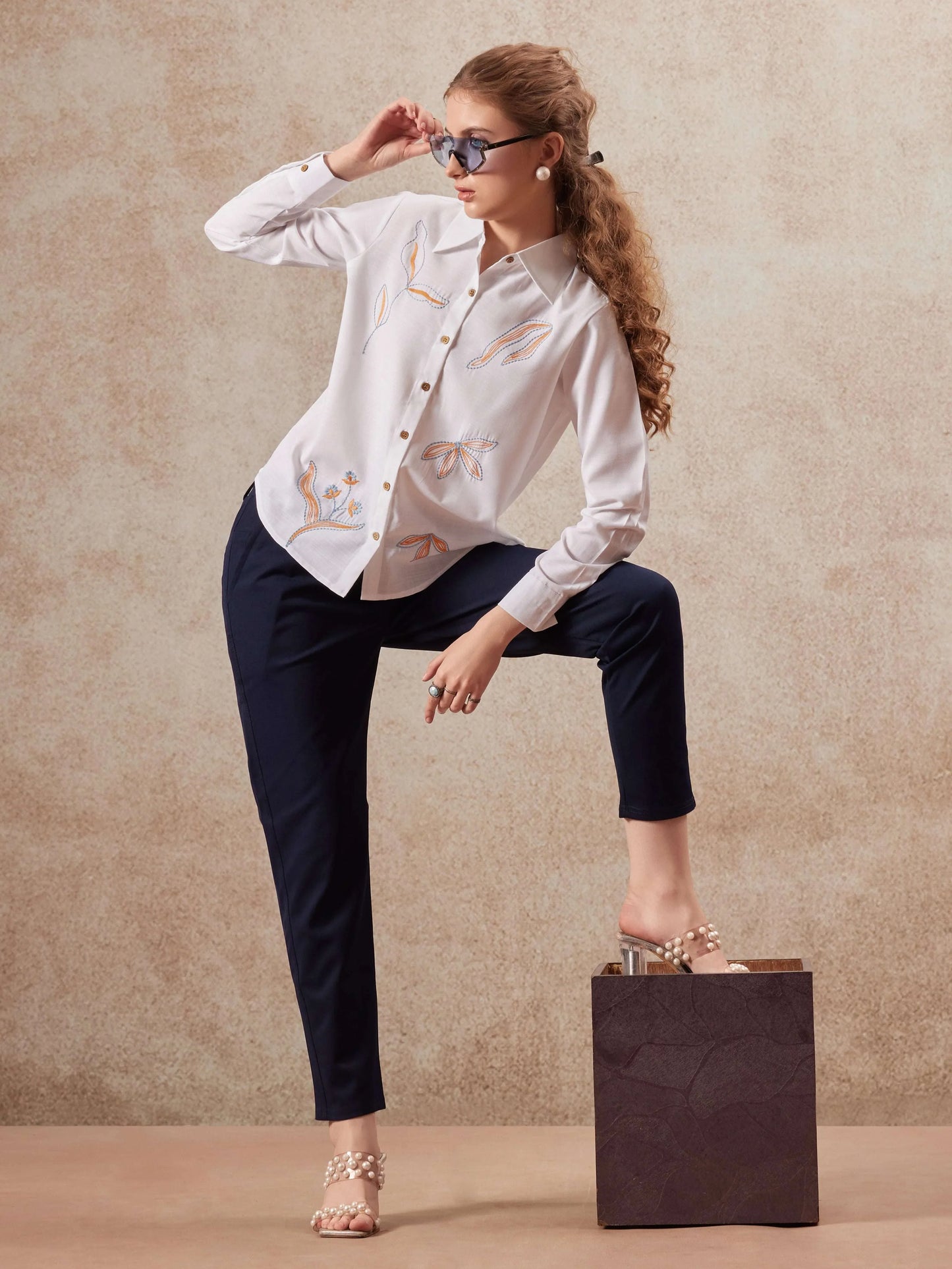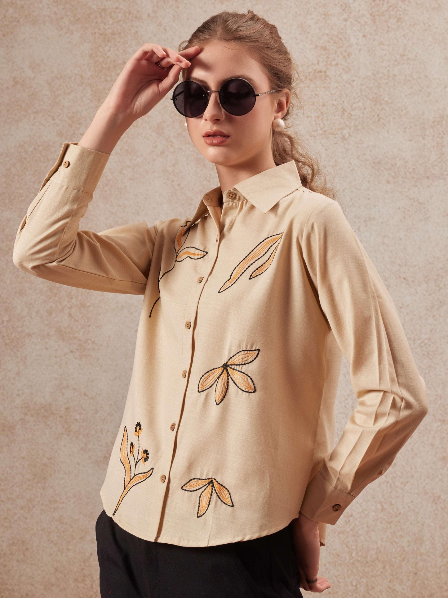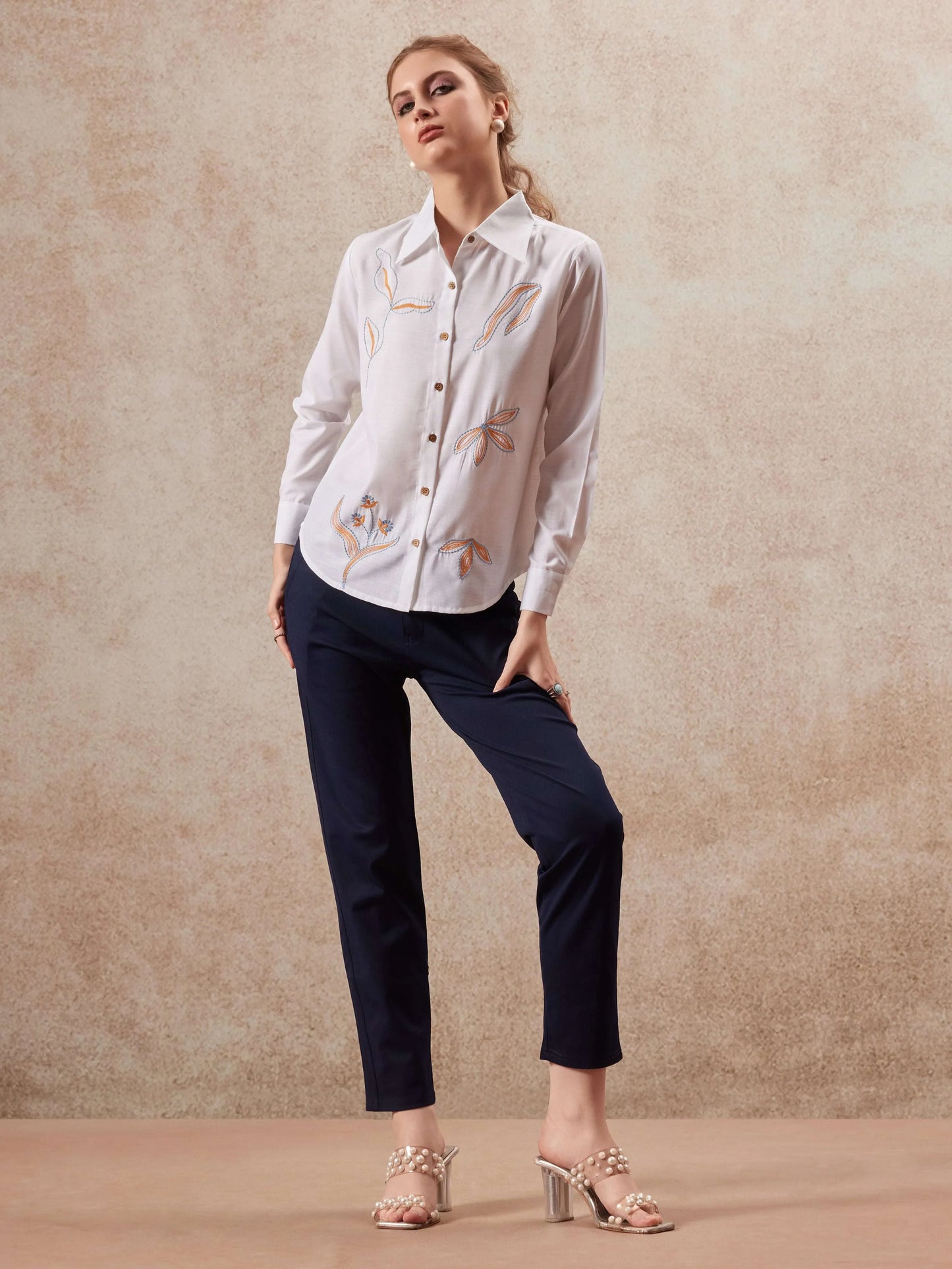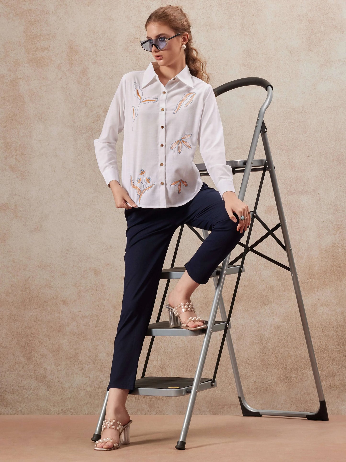 This women’s embroidered shirt is thoughtfully designed to blend everyday comfort with refined style, making it a versatile addition to your wardrobe. Crafted from soft, breathable fabric, it offers a smooth feel against the skin while ensuring all-day ease. The classic collared neckline and full button-down front create a timeless silhouette that works effortlessly for both casual and semi-formal settings. Delicate embroidery details placed across the front add an elegant, handcrafted touch, enhancing the overall look without appearing overpowering. The full-length sleeves with structured cuffs provide a polished finish, while the regular fit allows comfortable movement and a flattering drape on different body types. Easy to style, this shirt pairs beautifully with trousers, skirts, or denim, making it suitable for office wear, casual outings, or smart everyday dressing. Designed for women who appreciate subtle detailing and versatile fashion, this embroidered shirt delivers a perfect balance of sophistication, comfort, and modern appeal.