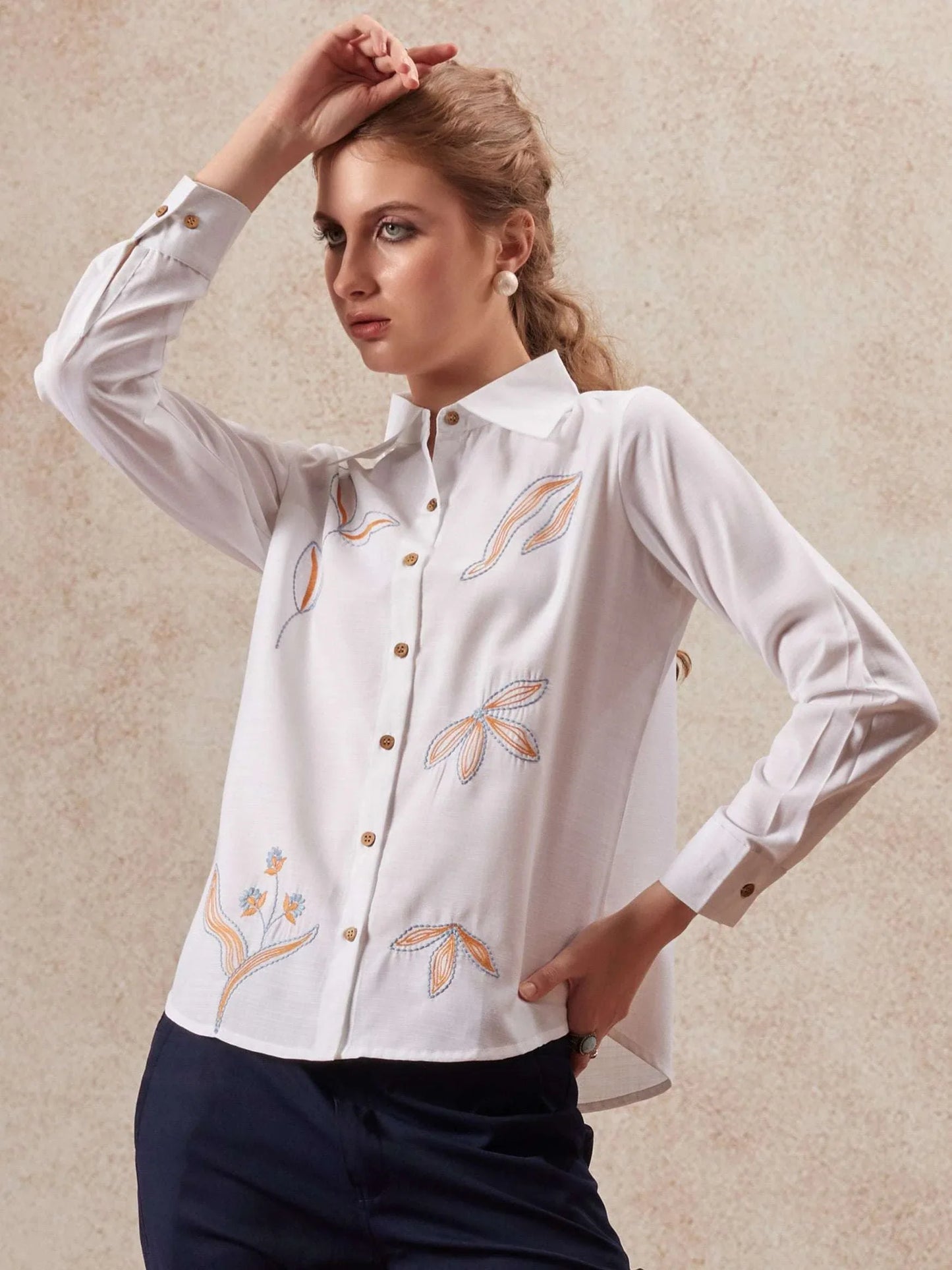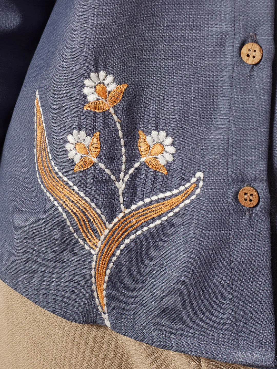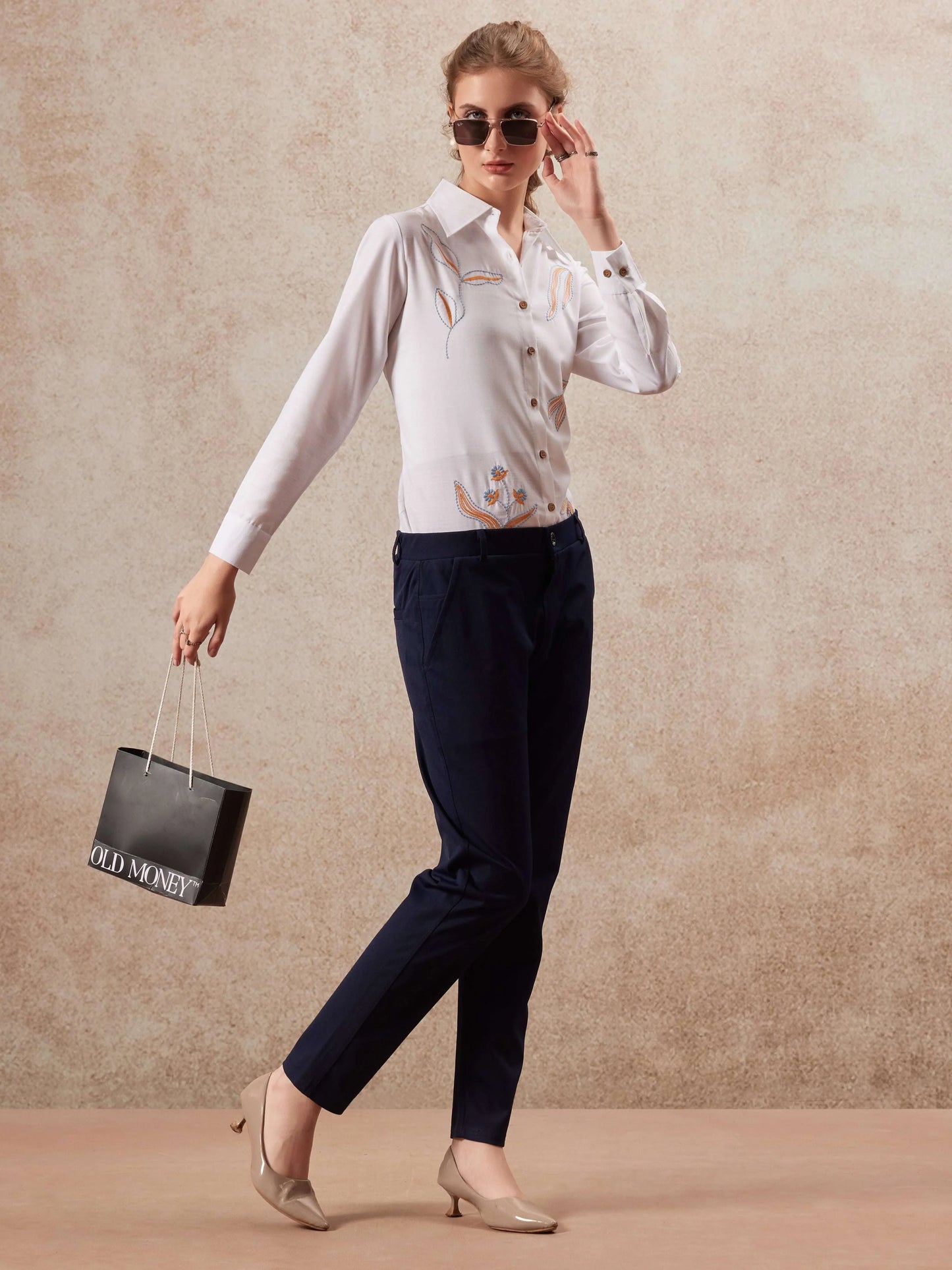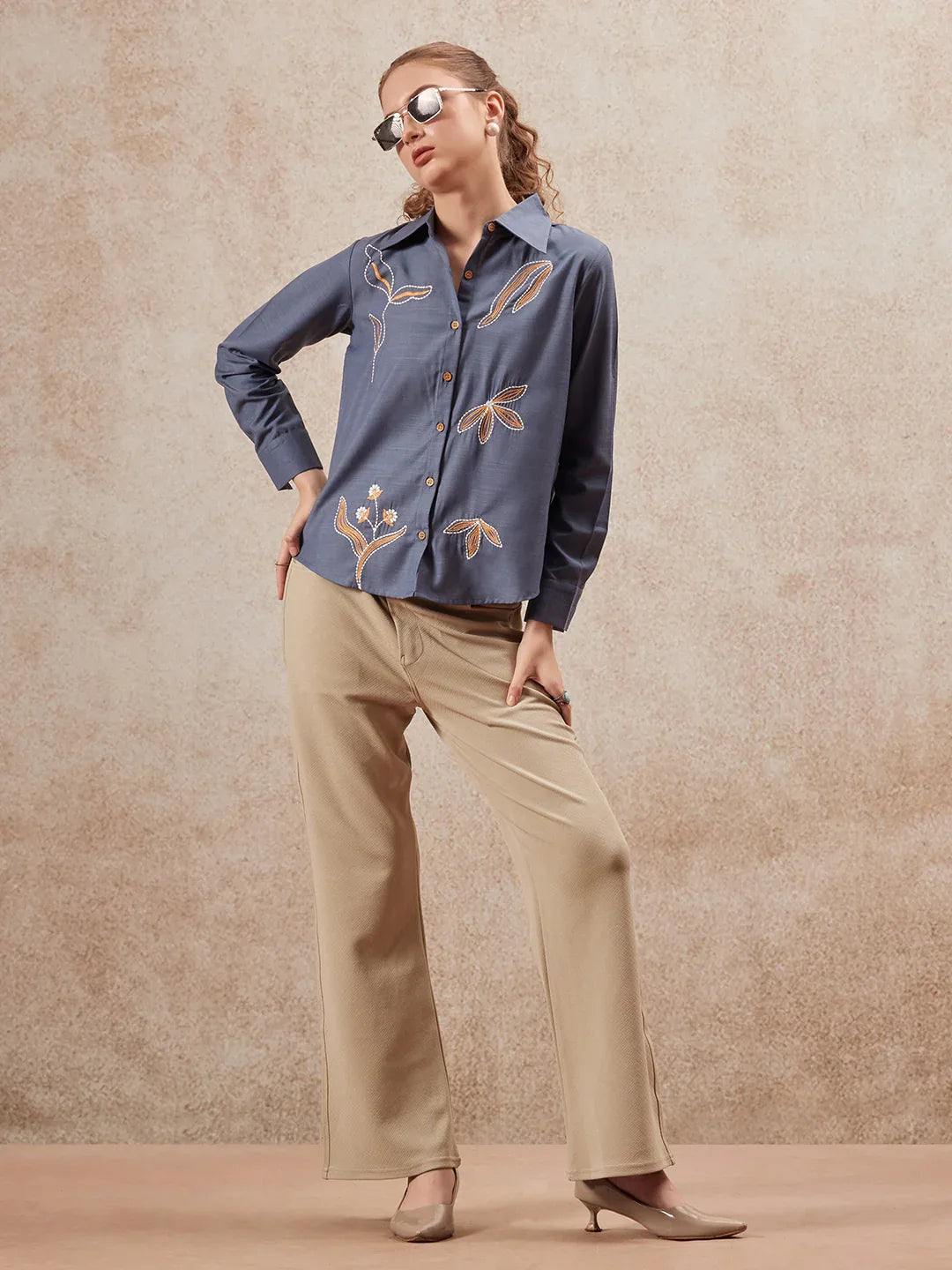 This women’s embroidered shirt is thoughtfully designed to blend everyday comfort with refined style, making it a versatile addition to your wardrobe. Crafted from soft, breathable fabric, it offers a smooth feel against the skin while ensuring all-day ease. The classic collared neckline and full button-down front create a timeless silhouette that works effortlessly for both casual and semi-formal settings. Delicate embroidery details placed across the front add an elegant, handcrafted touch, enhancing the overall look without appearing overpowering. The full-length sleeves with structured cuffs provide a polished finish, while the regular fit allows comfortable movement and a flattering drape on different body types. Easy to style, this shirt pairs beautifully with trousers, skirts, or denim, making it suitable for office wear, casual outings, or smart everyday dressing. Designed for women who appreciate subtle detailing and versatile fashion, this embroidered shirt delivers a perfect balance of sophistication, comfort, and modern appeal.