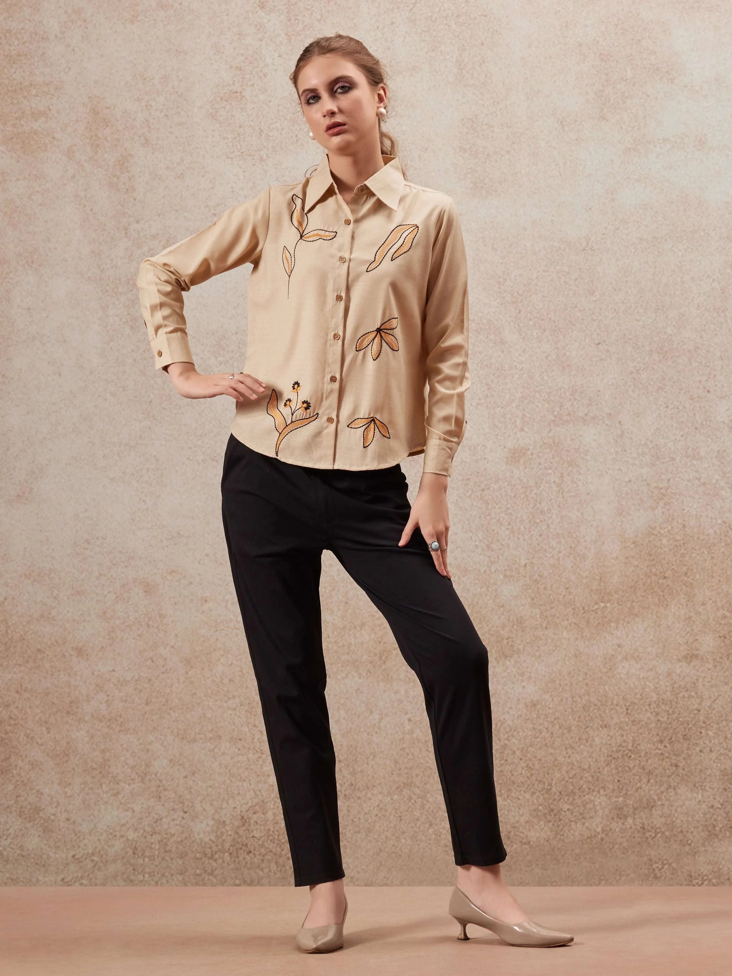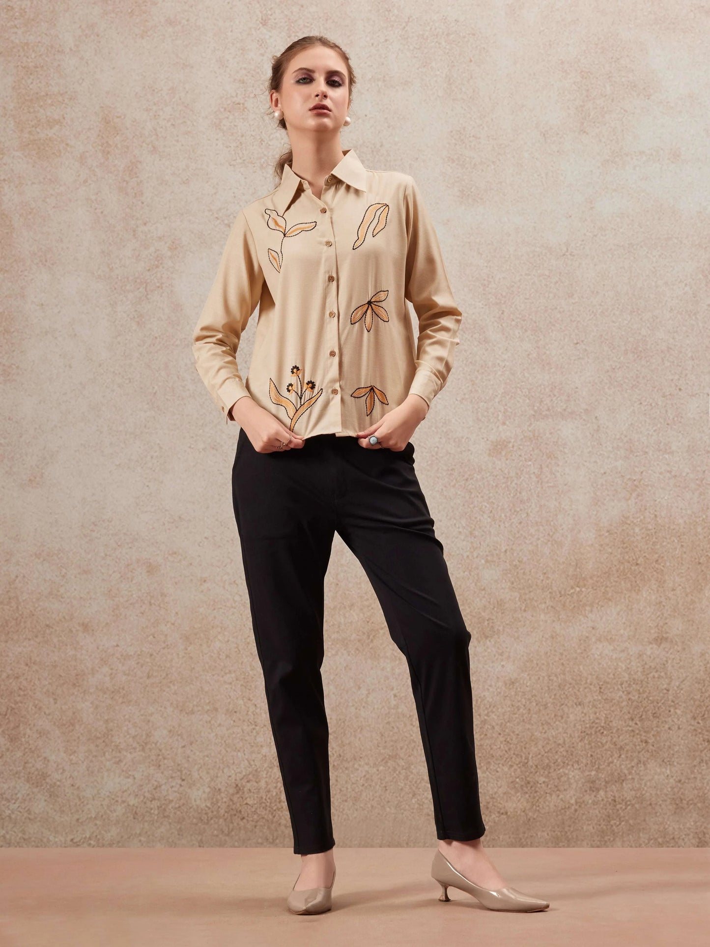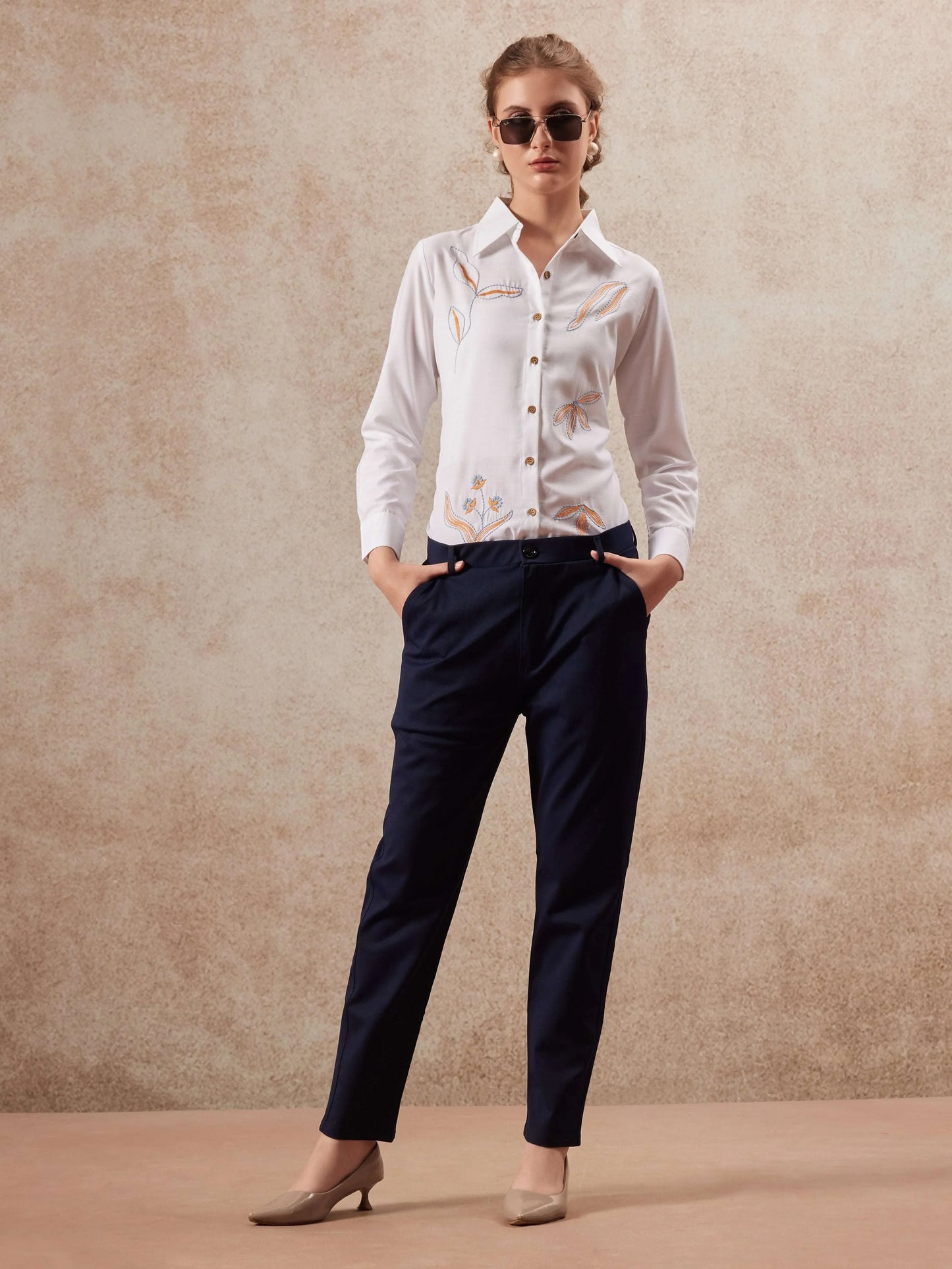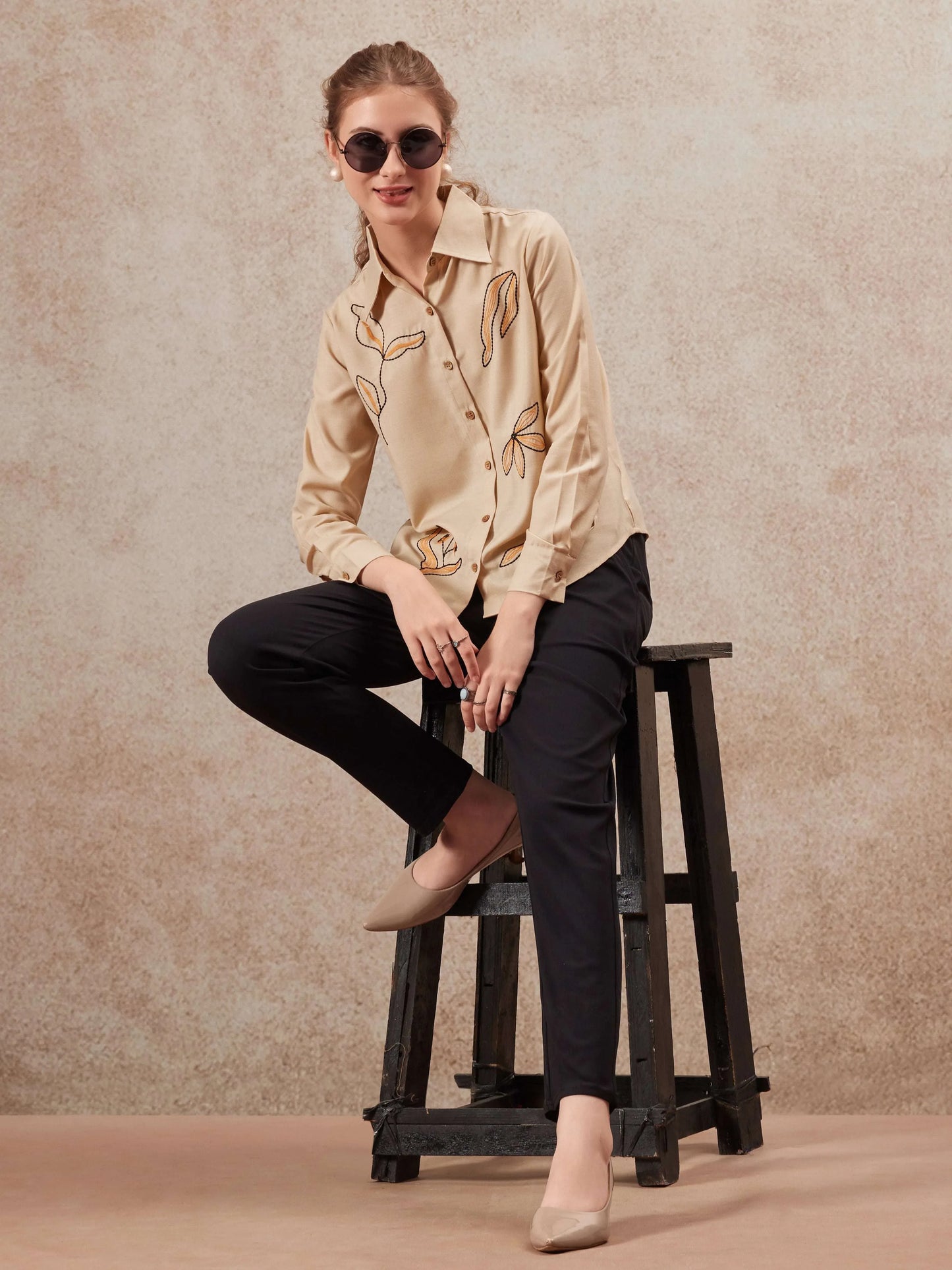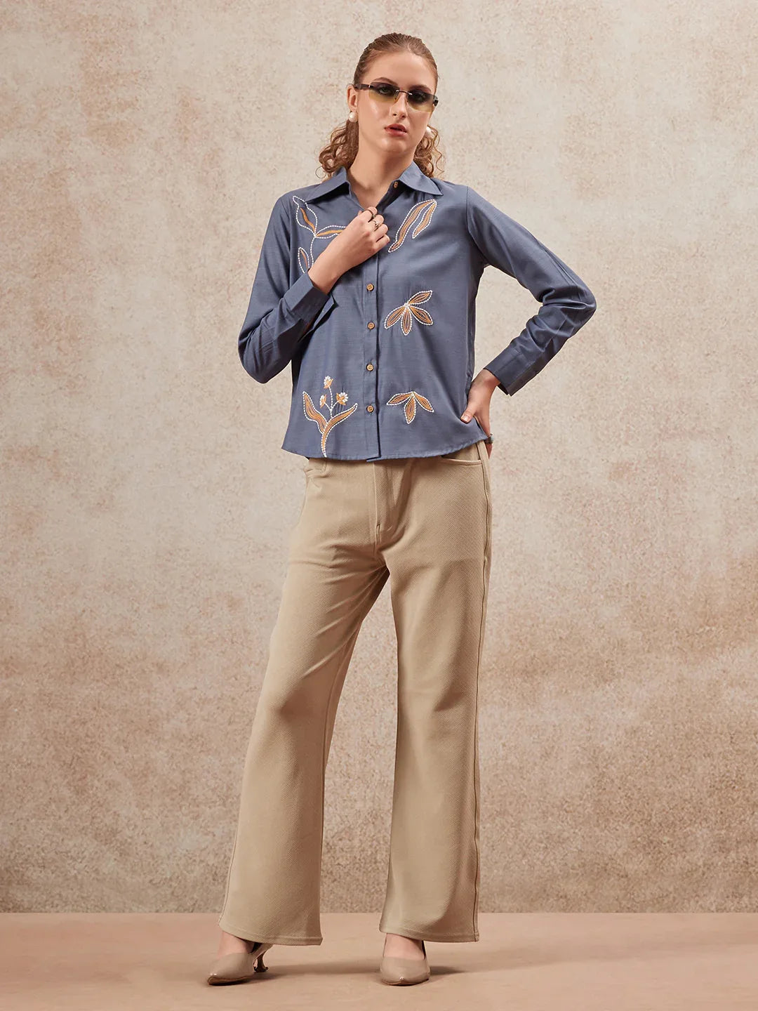 This women’s embroidered shirt is thoughtfully designed to blend everyday comfort with refined style, making it a versatile addition to your wardrobe. Crafted from soft, breathable fabric, it offers a smooth feel against the skin while ensuring all-day ease. The classic collared neckline and full button-down front create a timeless silhouette that works effortlessly for both casual and semi-formal settings. Delicate embroidery details placed across the front add an elegant, handcrafted touch, enhancing the overall look without appearing overpowering. The full-length sleeves with structured cuffs provide a polished finish, while the regular fit allows comfortable movement and a flattering drape on different body types. Easy to style, this shirt pairs beautifully with trousers, skirts, or denim, making it suitable for office wear, casual outings, or smart everyday dressing. Designed for women who appreciate subtle detailing and versatile fashion, this embroidered shirt delivers a perfect balance of sophistication, comfort, and modern appeal.
