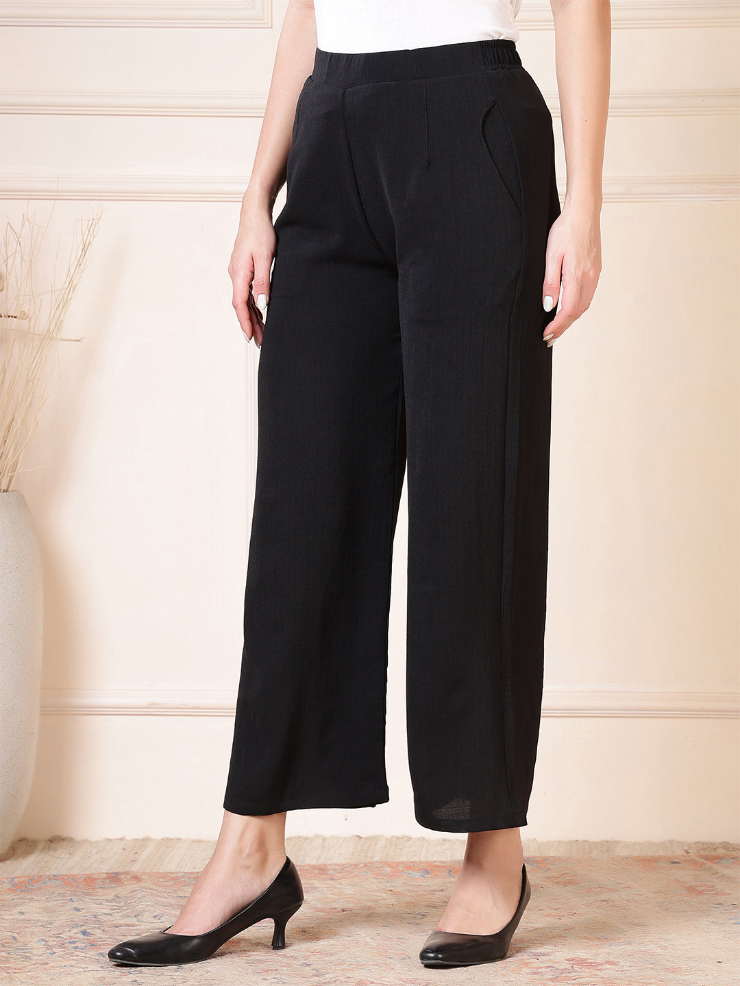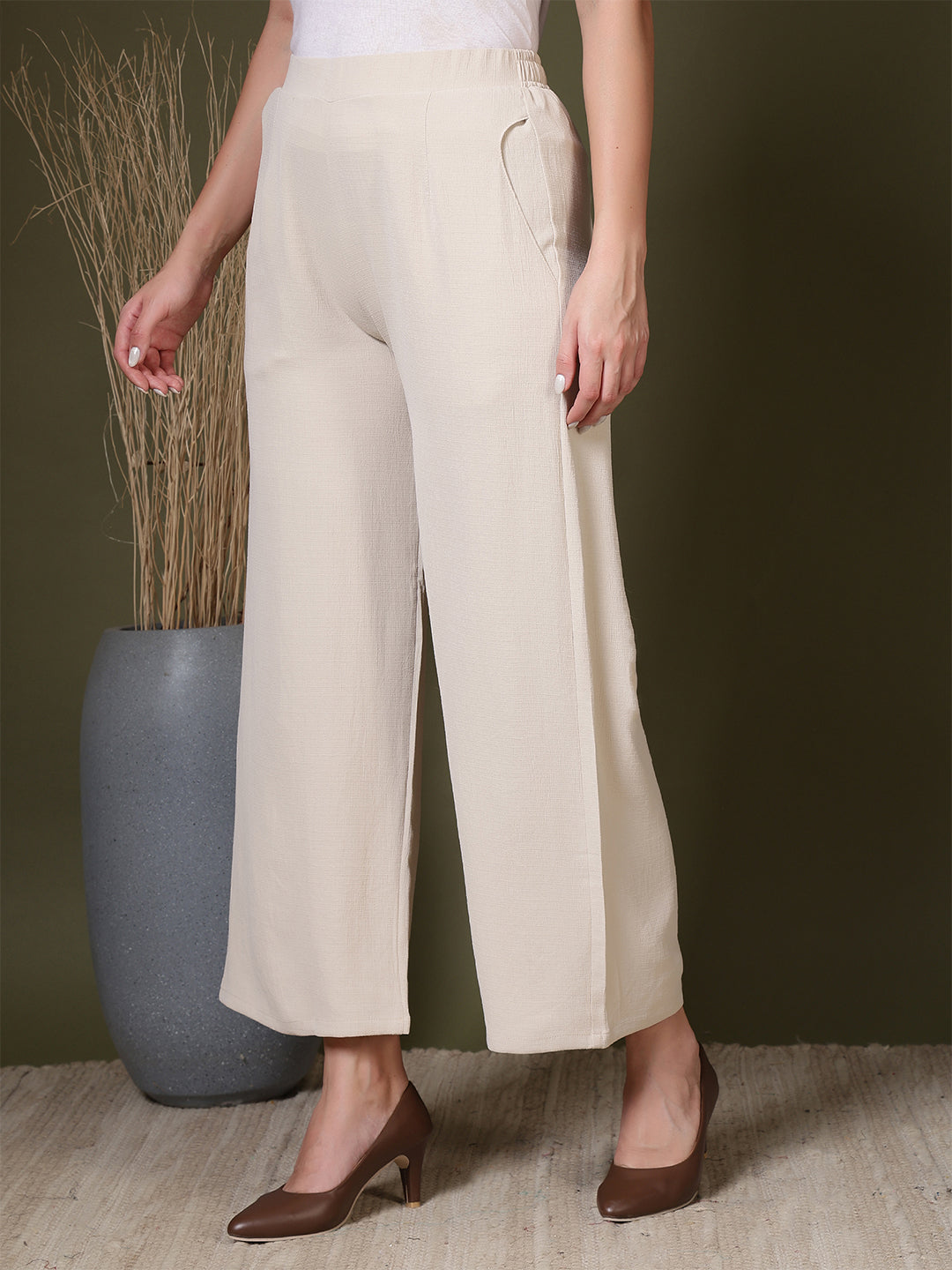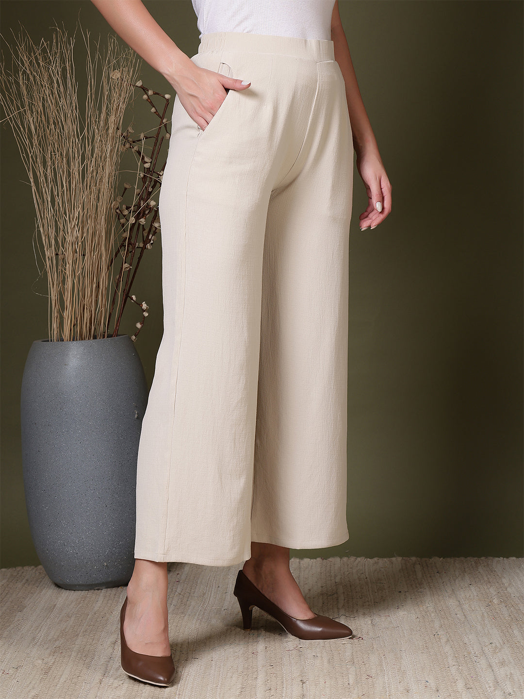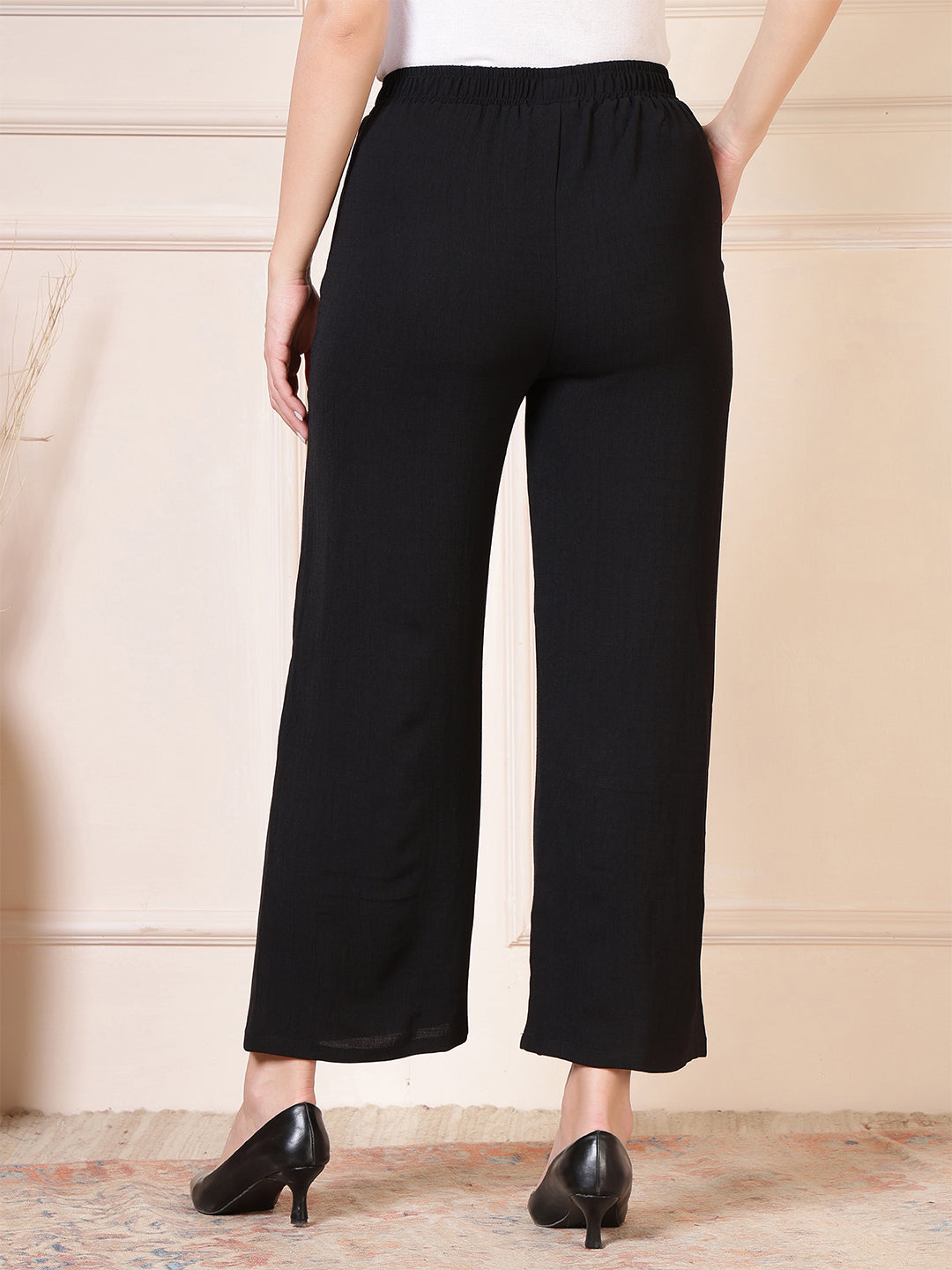 Upgrade your everyday wardrobe with these beautifully designed women’s palazzo pants, crafted for effortless style and all-day comfort. Made from a soft, breathable fabric with a subtle textured finish, these wide-leg trousers offer a relaxed yet refined silhouette that moves gracefully with every step. The high-waist design provides a flattering fit while ensuring maximum comfort, making these pants suitable for long hours of wear—whether you’re at work, running errands, or enjoying a casual outing. Convenient side pockets add practicality without compromising on elegance, giving you space to carry small essentials with ease. The flowy, wide-leg cut creates a timeless and versatile look that pairs effortlessly with both fitted tops and loose blouses, allowing you to dress it up with heels or keep it laid-back with flats. Perfect for both everyday styling and special occasions, these palazzo trousers are a must-have staple that blends comfort, sophistication, and modern minimalism in one effortlessly chic package.