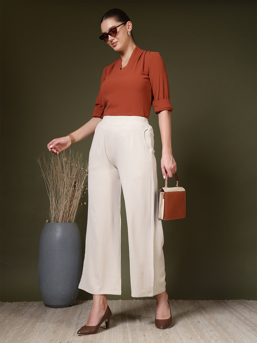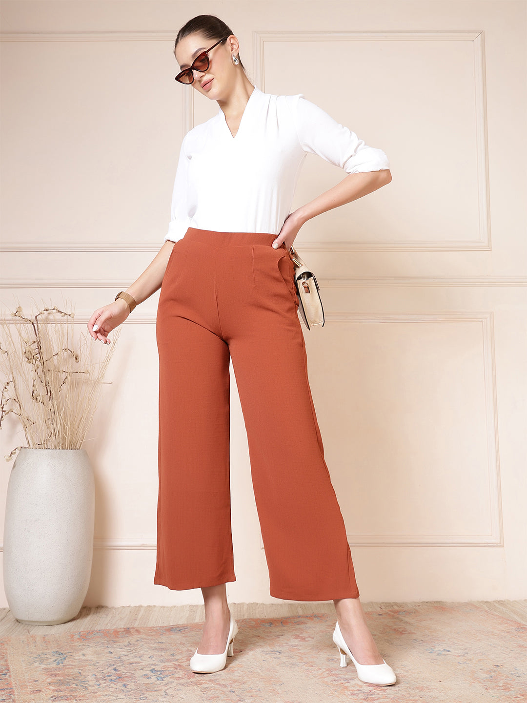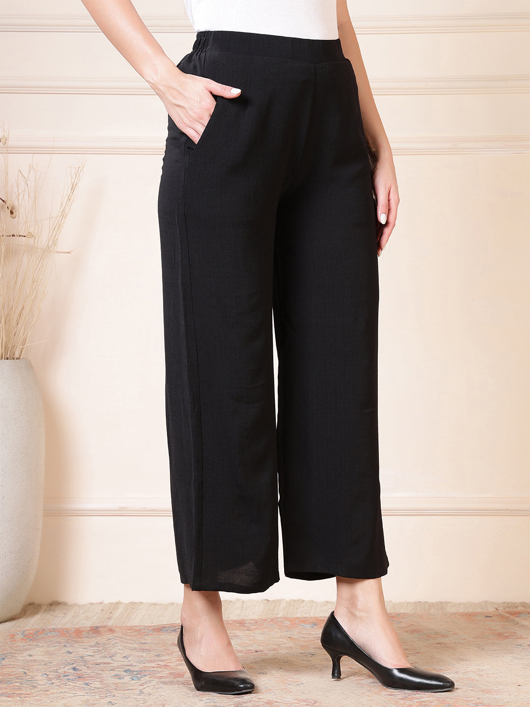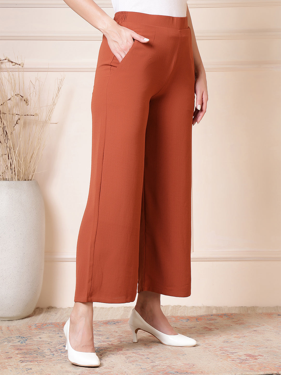 Upgrade your everyday wardrobe with these beautifully designed women’s palazzo pants, crafted for effortless style and all-day comfort. Made from a soft, breathable fabric with a subtle textured finish, these wide-leg trousers offer a relaxed yet refined silhouette that moves gracefully with every step. The high-waist design provides a flattering fit while ensuring maximum comfort, making these pants suitable for long hours of wear—whether you’re at work, running errands, or enjoying a casual outing. Convenient side pockets add practicality without compromising on elegance, giving you space to carry small essentials with ease. The flowy, wide-leg cut creates a timeless and versatile look that pairs effortlessly with both fitted tops and loose blouses, allowing you to dress it up with heels or keep it laid-back with flats. Perfect for both everyday styling and special occasions, these palazzo trousers are a must-have staple that blends comfort, sophistication, and modern minimalism in one effortlessly chic package.